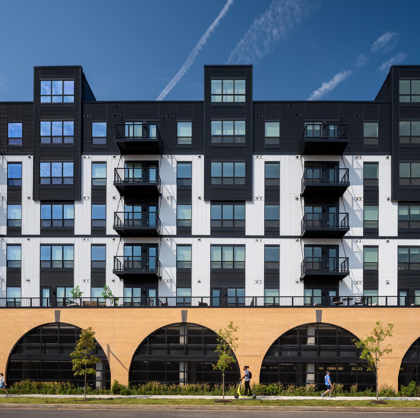 Harwood Flats is a two-phase, 569-unit, mixed use development that reinvigorates the site of a former suburban office building into a walkable, transit-oriented community. The first phase is a 400,000 sf building which will consist of 335 apartment homes sitting atop 5,000 sf of ground-floor shops along Nicholson Street. The apartments are arranged around a central courtyard with amenities including a pool, outdoor patios and fitness areas. A five-level above grade parking garage will provide parking for 240 cars and 100 bicycles.