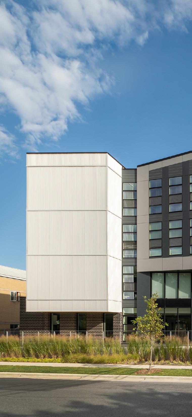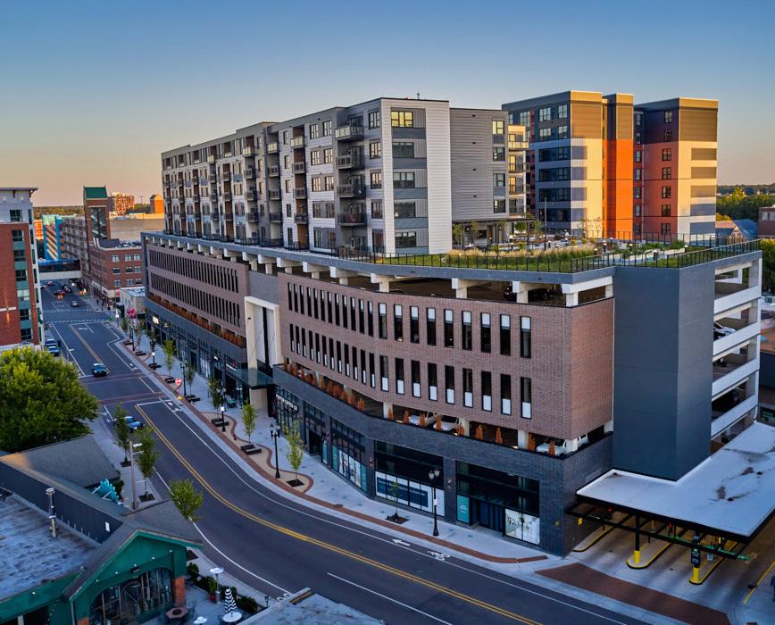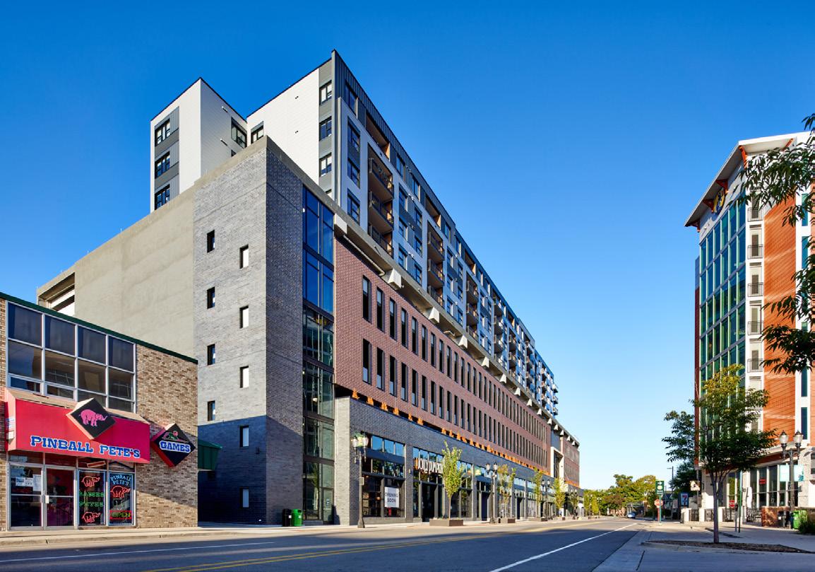 Located across from the Michigan State University campus in downtown East Lansing, the project is one part student living (Landmark on Grand River), and one part active adult (Newman Lofts), with both being positioned as market-rate residences. The projects’ towers include landscaped courtyards, a fitness center, conference spaces, group study lounges, a game room, library, and a chef’s kitchen as well as a dedicated dog run. The ground floor houses retail space, and the street will be converted to a curbless “complete street” to accommodate the existing festivals that are held on the surface lot to create a flexible, active, and diverse pedestrian corridor.