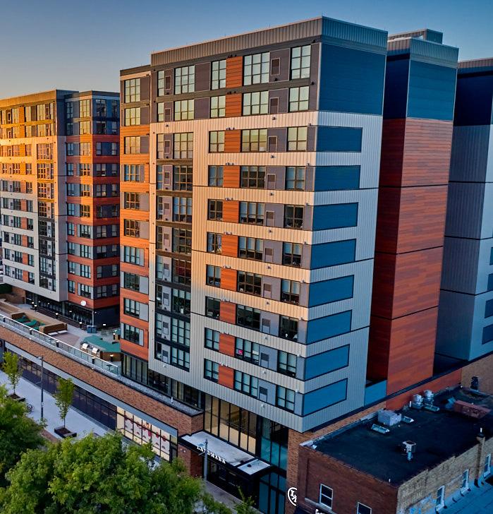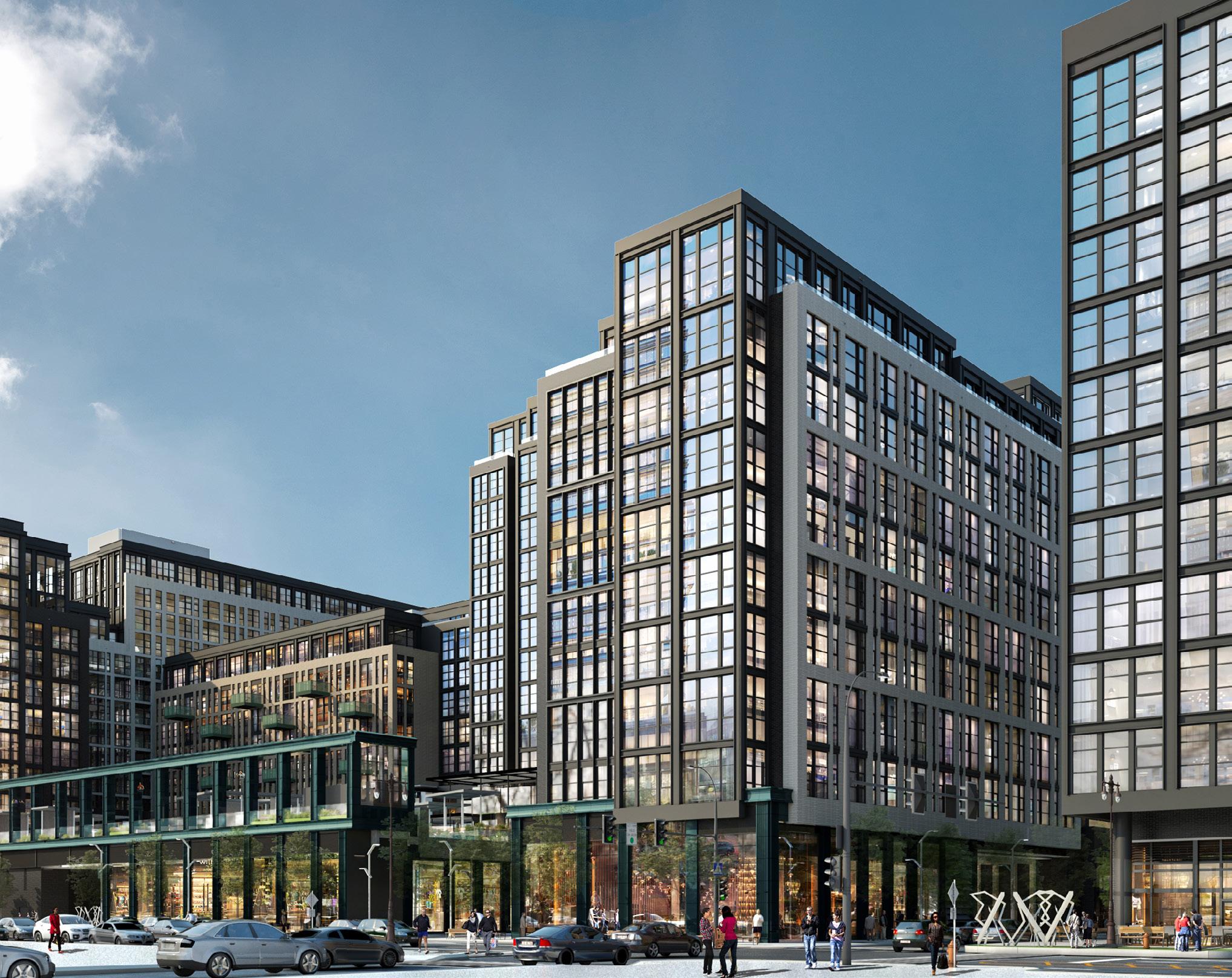 Series of steel-stud framed massings over a two-story concrete podium; features a central courtyard plaza and retail edge.