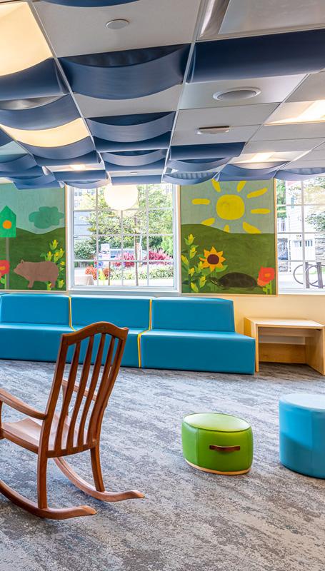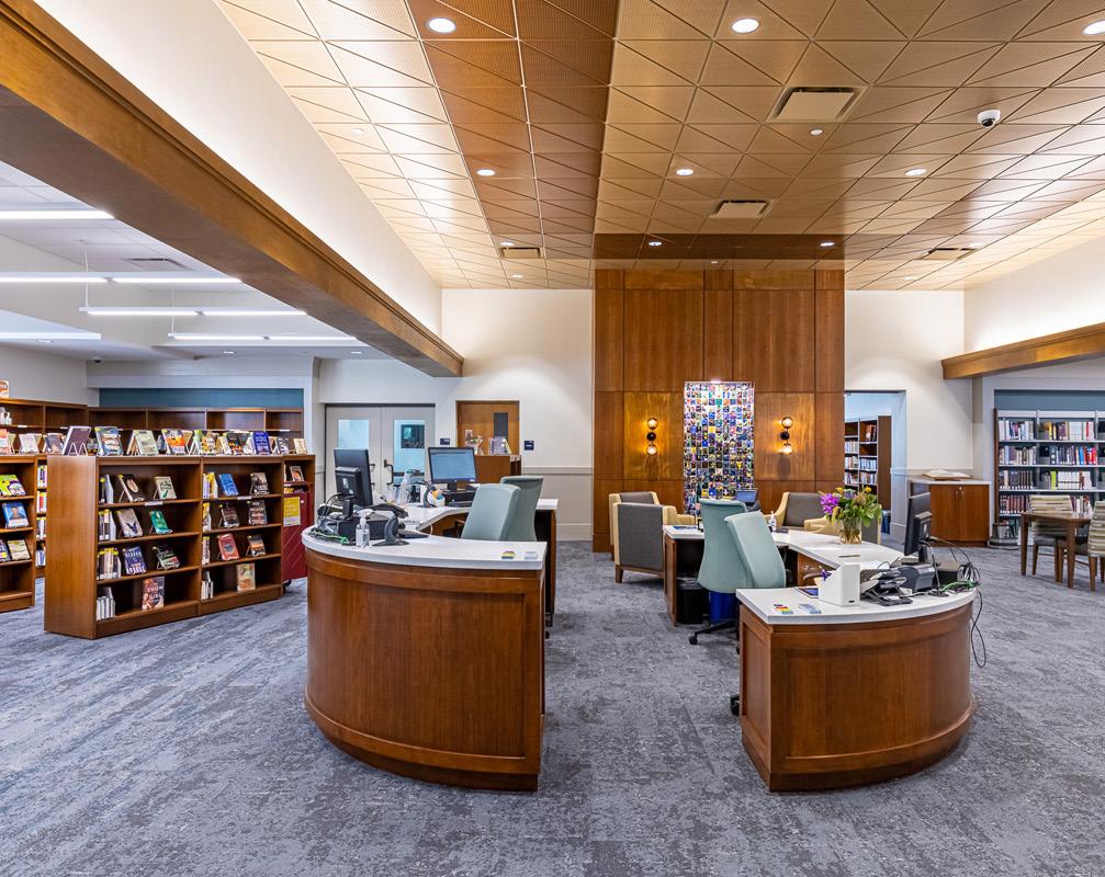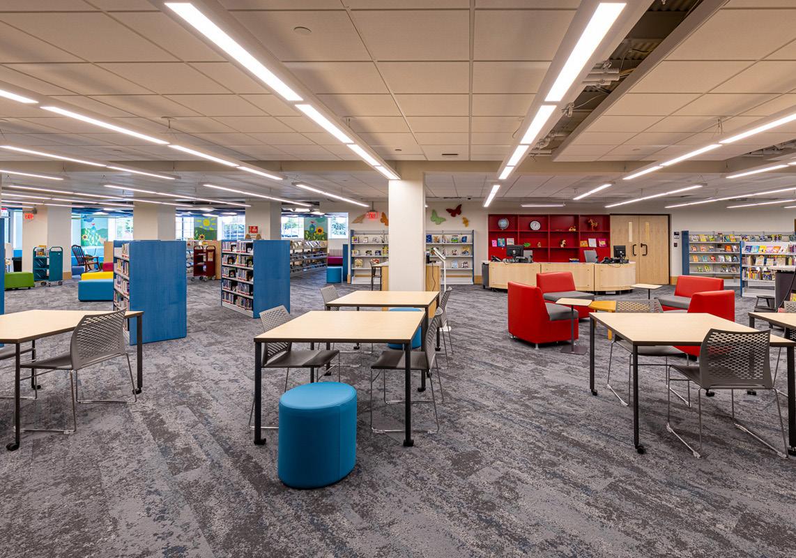 To maintain service during construction, BKV Group coordinated a temporary modular library facility, including shelving layouts that required no structural modifications, reducing costs and simplifying operations. The completed LEED Silver facility enhances the user experience with reconfigured collections and dedicated spaces for different age groups, providing a modern, functional, and welcoming community hub.