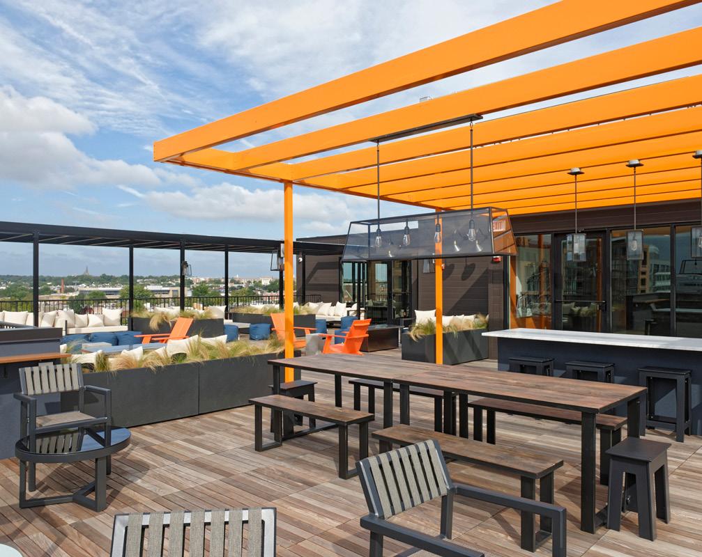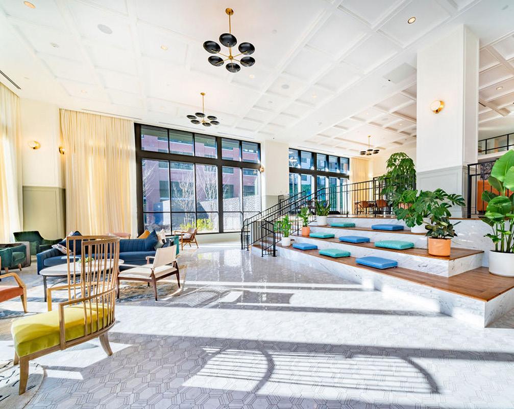 The basement includes a collaborative business center, fitness room, and pool lounge, while the rooftop Great Hall and Lounge offer a lounge, game room, and terrace with sweeping views of the Mall, the Capitol, and the Washington Monument.