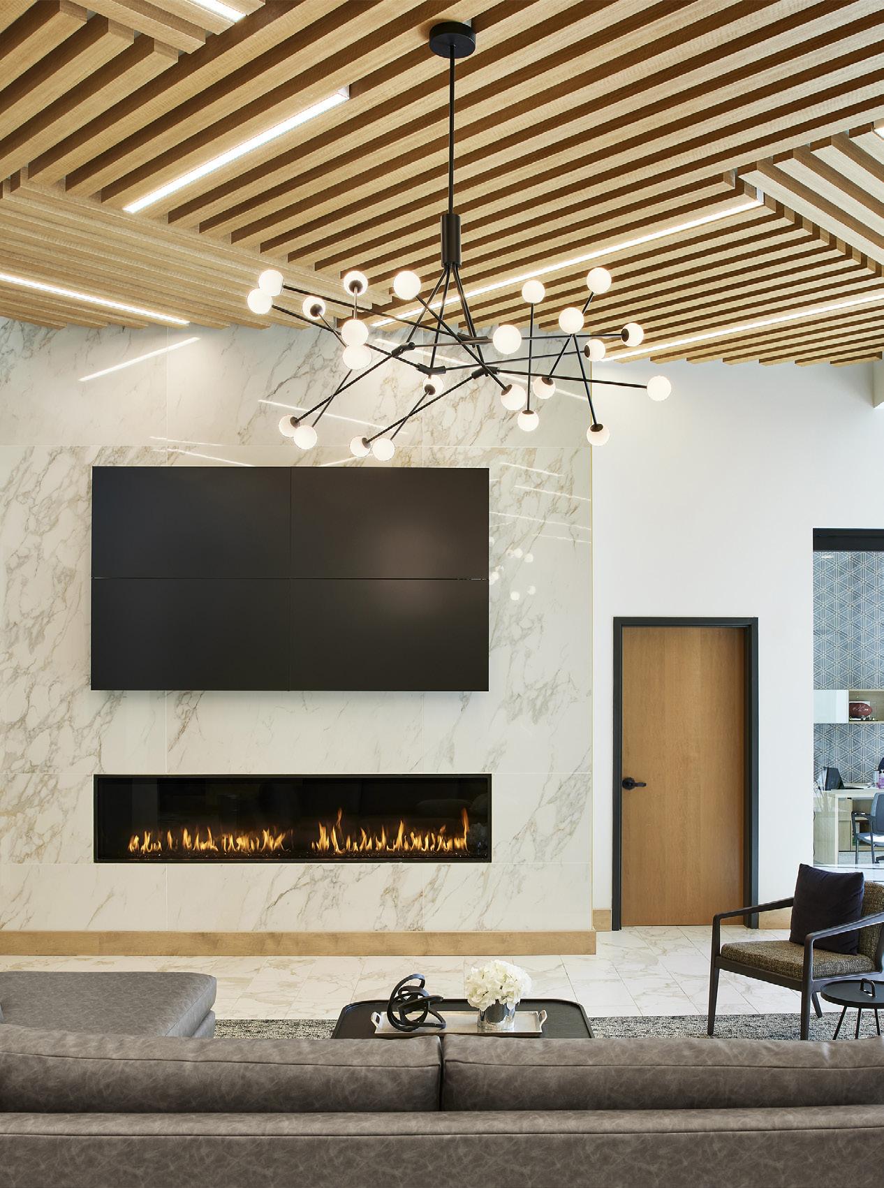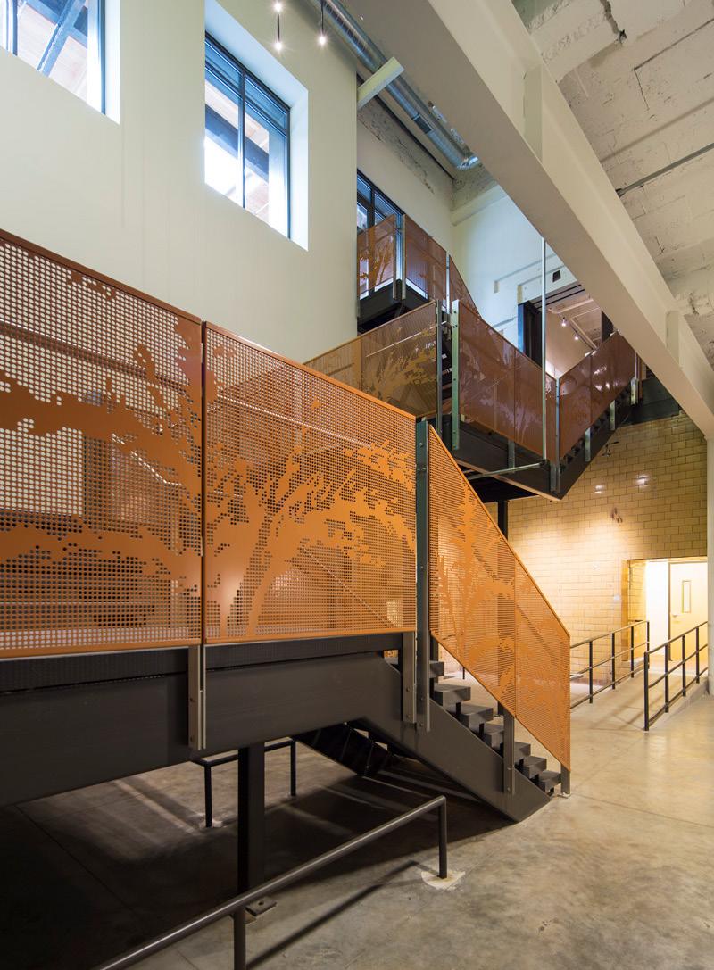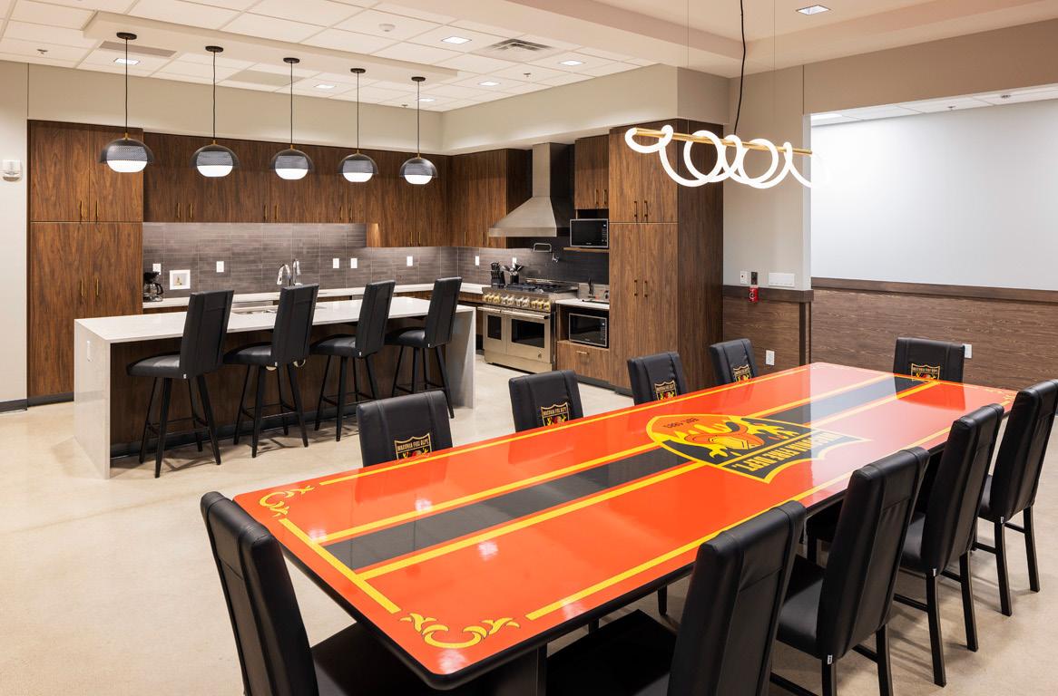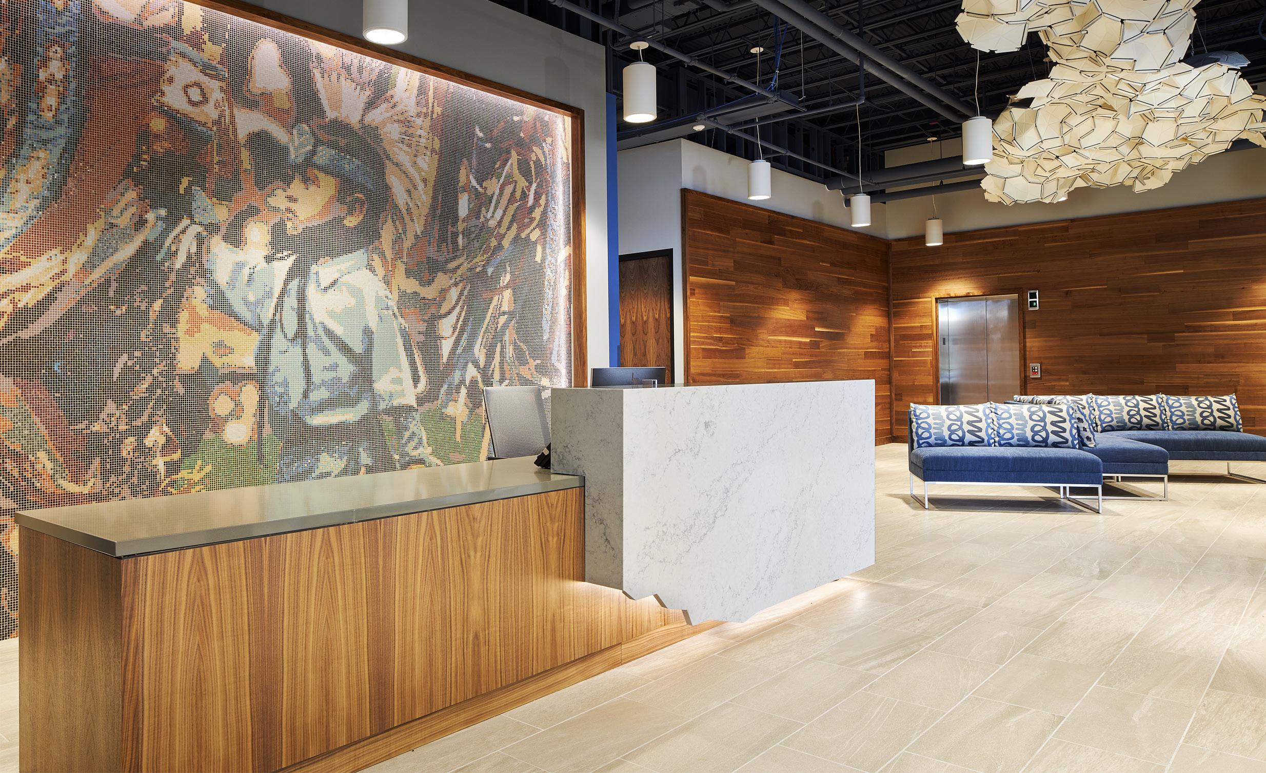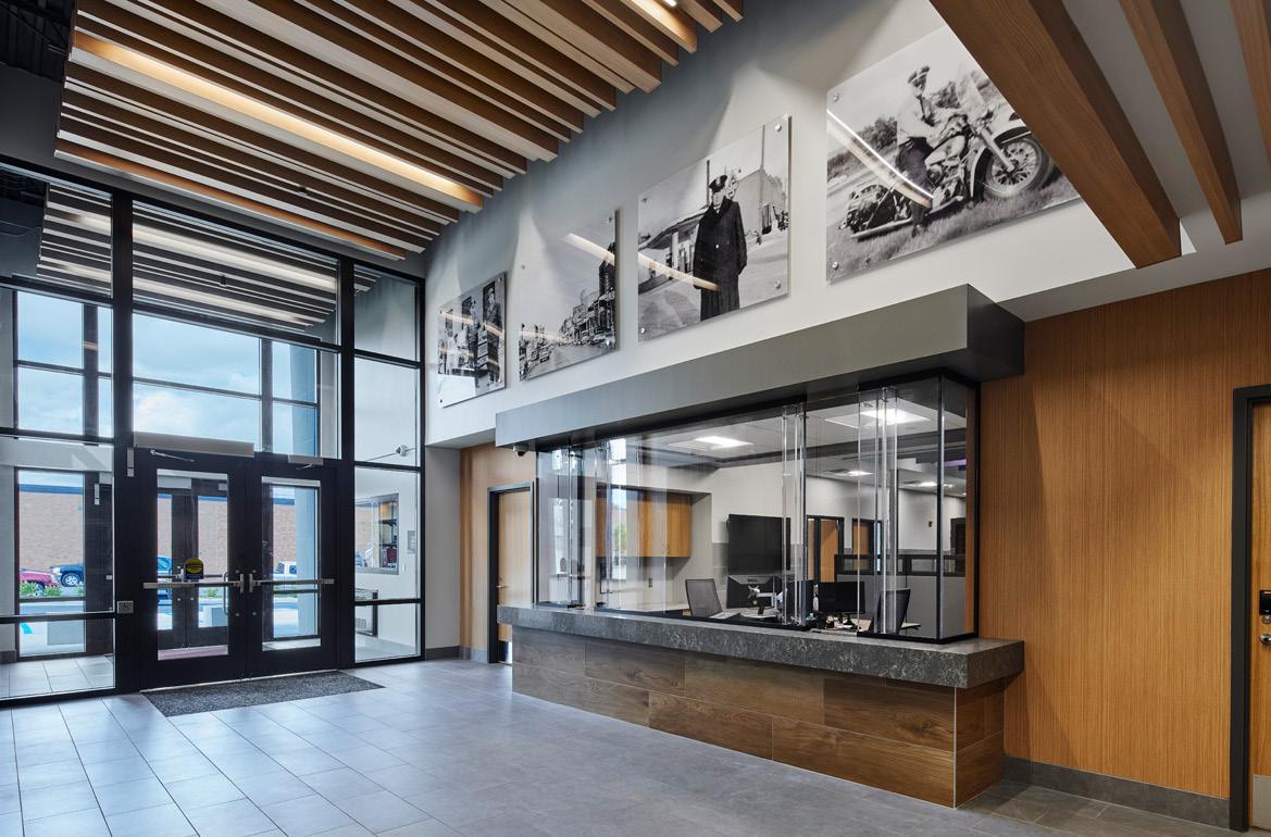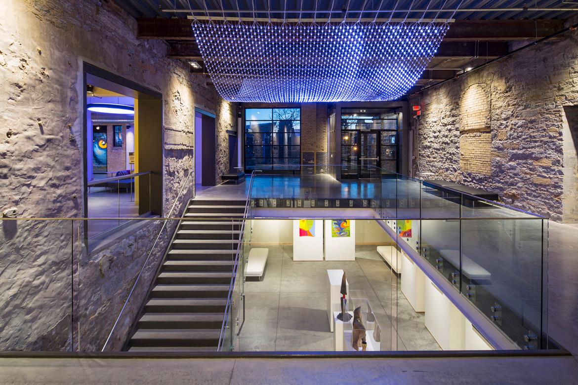 The design integrates prominent Band figures, artifacts, and Ojibweinspired motifs through feature walls, built-in displays, perforated partitions, and etched glazing. Decorative lighting, bold accent colors, and wayfinding elements enhance visual interest throughout the space, including a mosaic at the main reception and “modern heroes” feature walls at elevator lobbies.