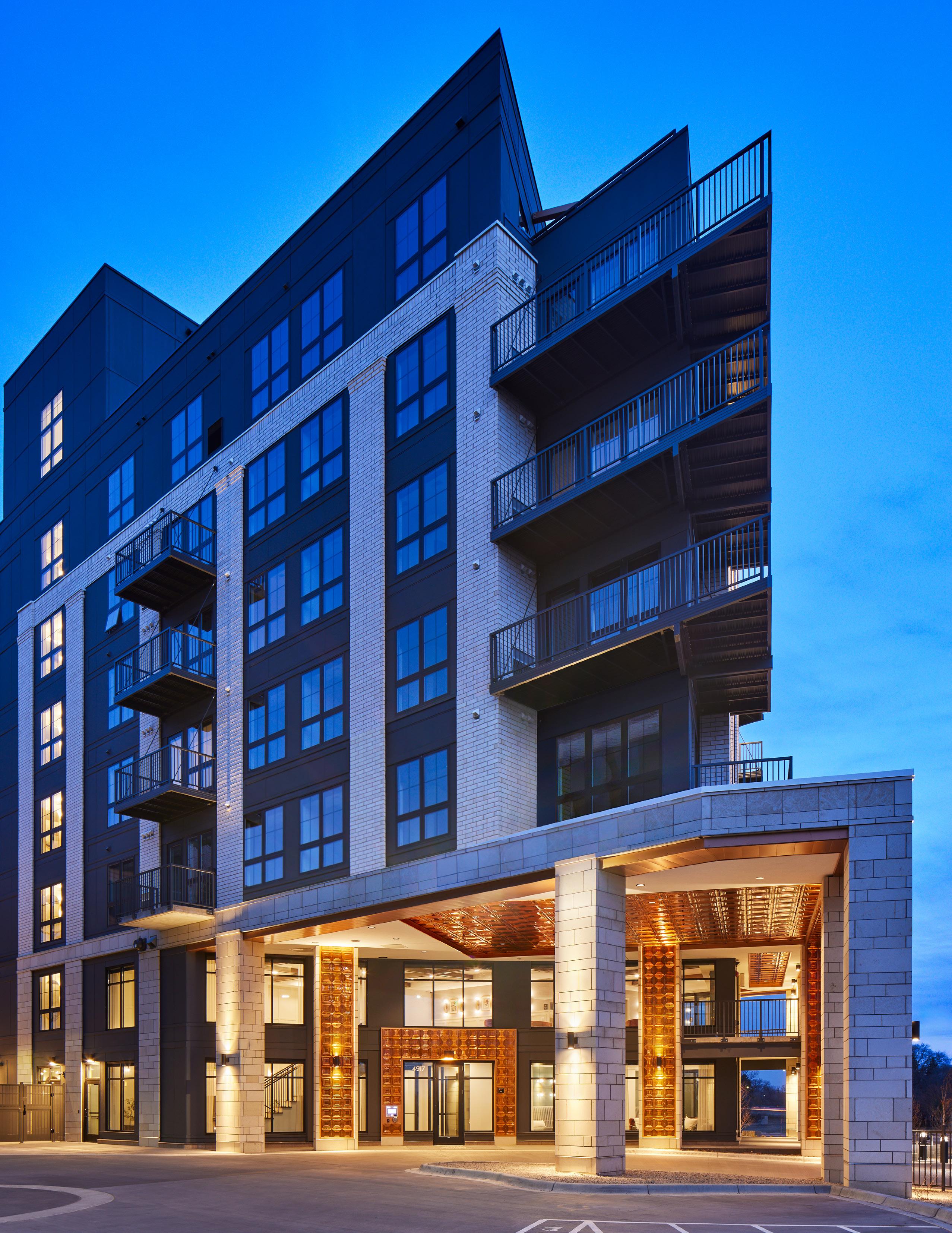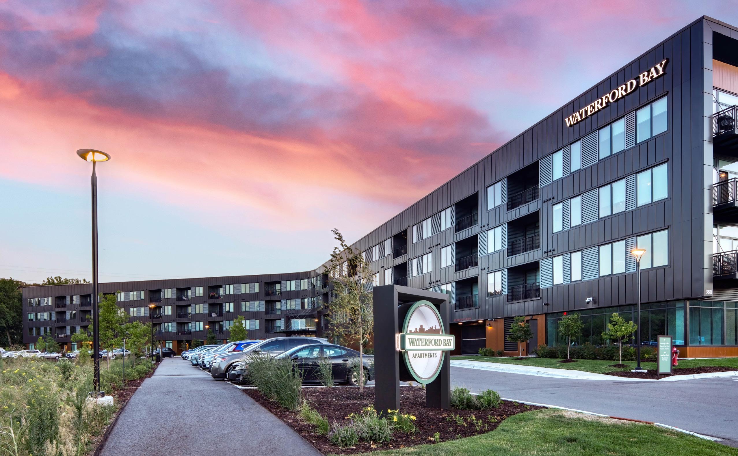 Waterford Bay apartments is a partial wrap residential development with a parking structure at its center and dwelling units surrounding it on three sides. The ground level is activated through the entry, amenity spaces, and units which are accessed directly from the exterior. The upper 3 floors frame two court-yards that are separated by an amenity pavilion. The design evolved in response to site constraints, presenting a lower 3-story façade toward the river while rising to a 4-story expression along Randolph street and the Mississippi River inlet. The bent form along the northeast flares at the ends serving both as a marquee design element while at the same time drawing a person to the primary entry point located at its center.