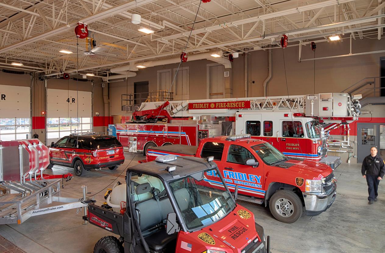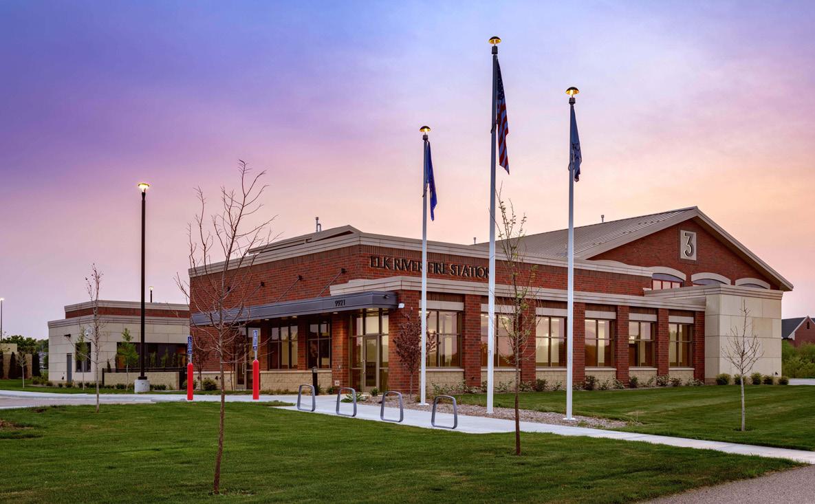 A 100-person community room near the street serves for training and civic events, including polling, while staff offices maintain quick access to the bays. The site features a dedicated apparatus return drive, deep rear apron for maneuvering and staging, and public parking areas. The building’s exterior references Waconia’s first fire station with a brick façade, flat roofs, framed glass apparatus doors, a tower element, and stone accents.