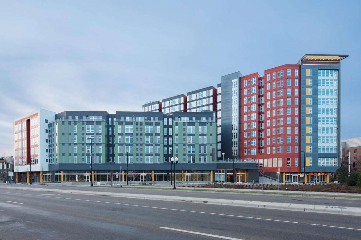 WaHu Student Apartments are a mixed-use development located just east of the University of Minnesota in the Prospect Park neighborhood of Minneapolis. The site is located across from the Stadium Village stop on Metro Transit’s Green Line. This prominent location presented a unique opportunity to design a gateway building at the end of the campus that serves as a catalyst for future transitoriented development in the area.