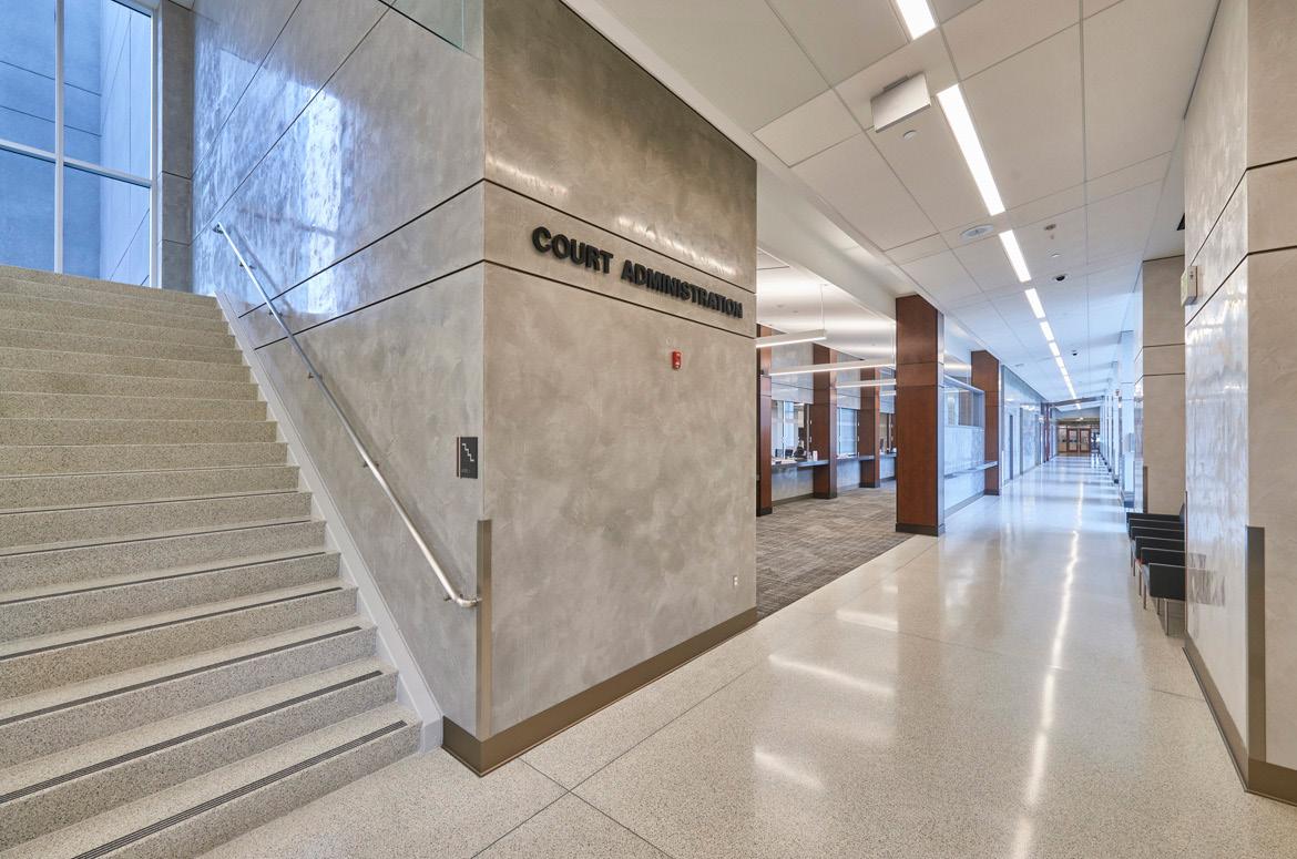 Designed for both security and collaboration, the facility features full public and staff security screening, secure inmate holding and transfer corridors, multiple group holding cells, inmate elevators, secure visitation areas, and bailiff stations. The building emphasizes natural light, staff collaboration, and timeless contemporary design while serving as a model for secure courthouse planning. Construction began in May 2018 and was completed in May 2020.