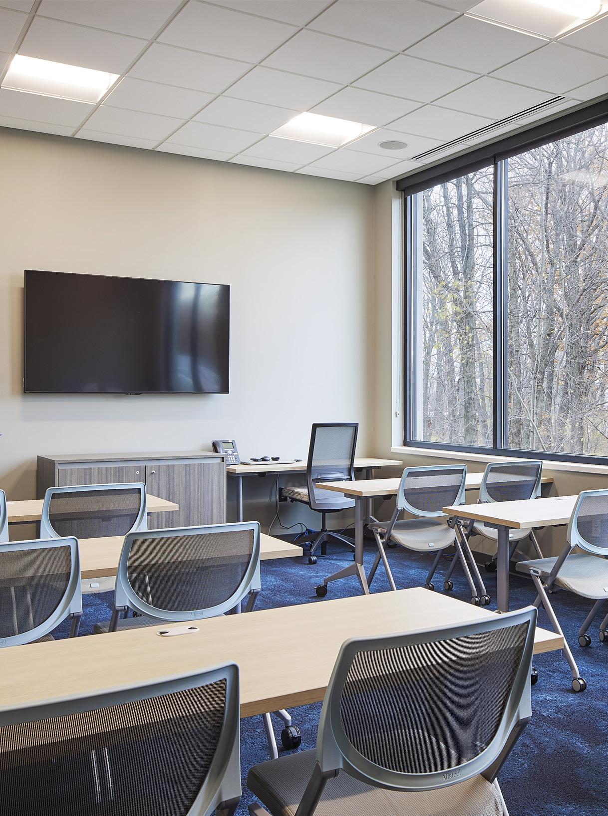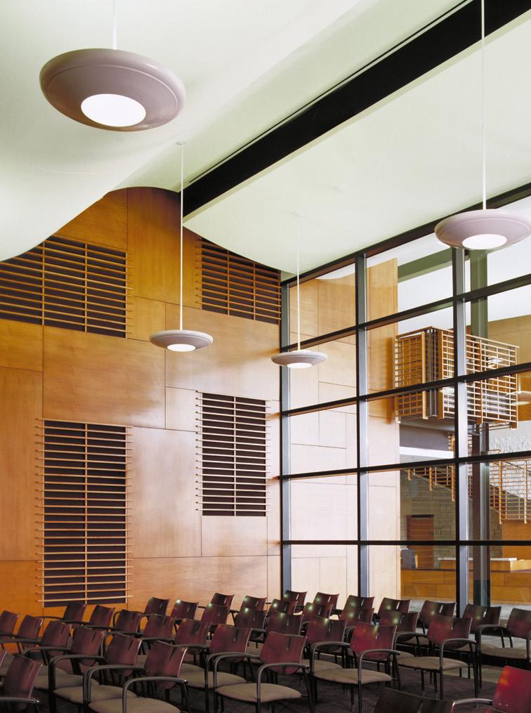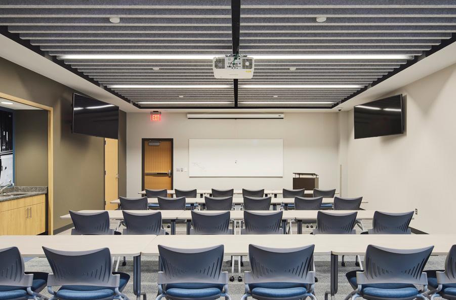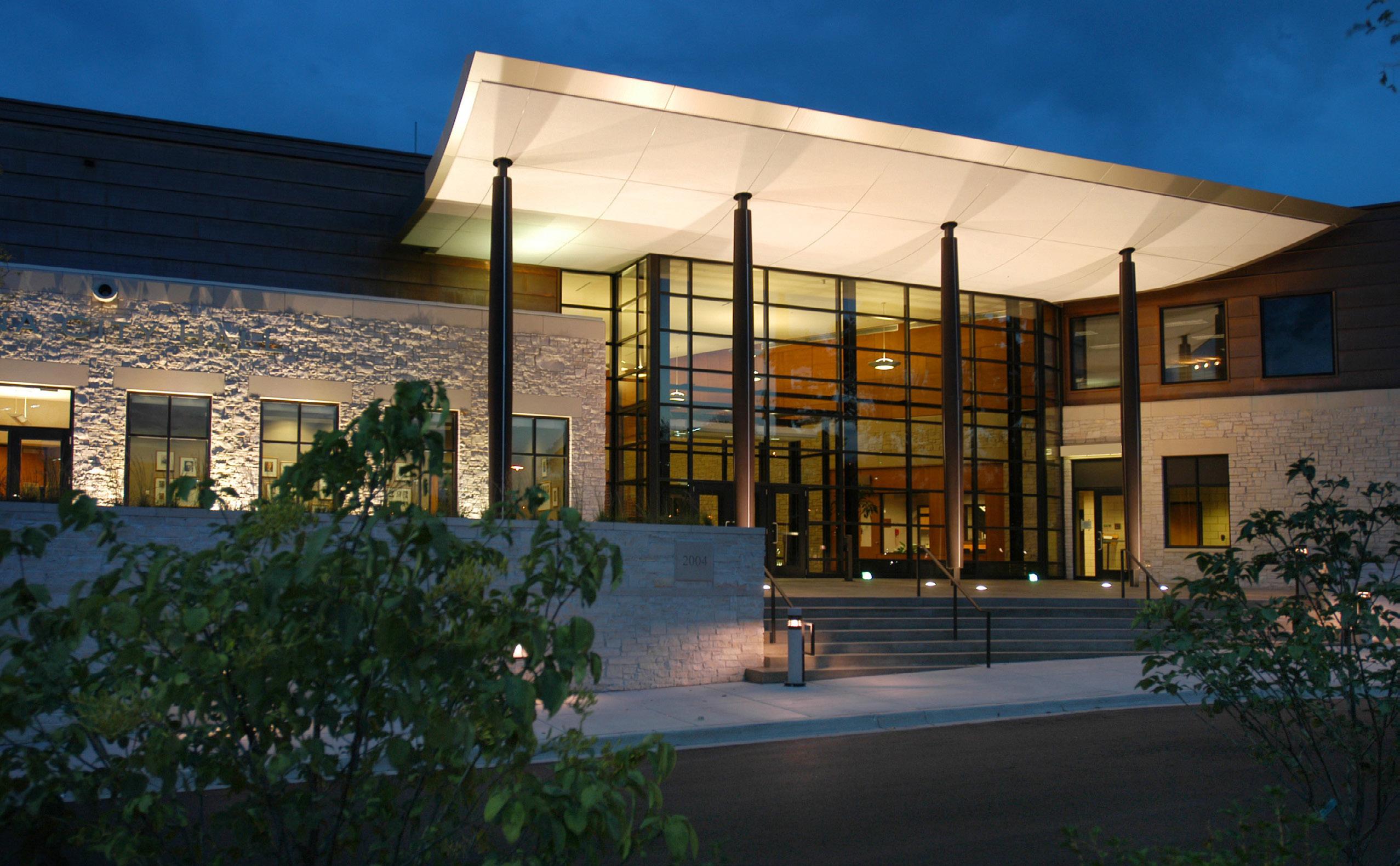 The Edina City Hall and Police Facility, located on a highly visible and particularly challenging triangular site surrounded by mature trees and high-value properties, is grounded with a stone plaza linking the site, parking, exterior plazas, and lobby with the neighboring community. The two-story building supports the city operations and public services, including council chambers, public conference rooms and the police department with secured underground parking. On such a visible site, it facilitates open communication to connect its multiple functions.