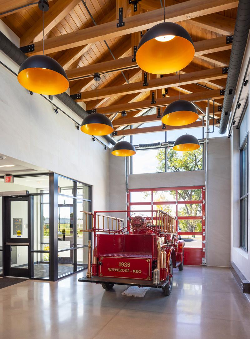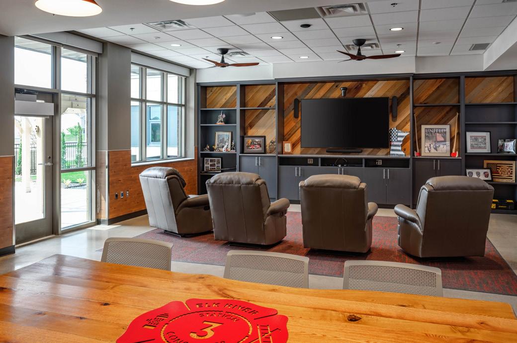Public spaces, including a naturally lit community room, showcase historical imagery of the department, creating a welcoming environment that strengthens community identity. The design incorporates biophilic principles, natural materials, and warm finishes to reduce stress for staff and visitors. Security is integrated through ballistic glazing, reinforced masonry, and interior ballistic-resistant materials in key areas. The station balances operational efficiency, staff wellness, and community engagement, providing a modern, safe, and inviting civic resource.