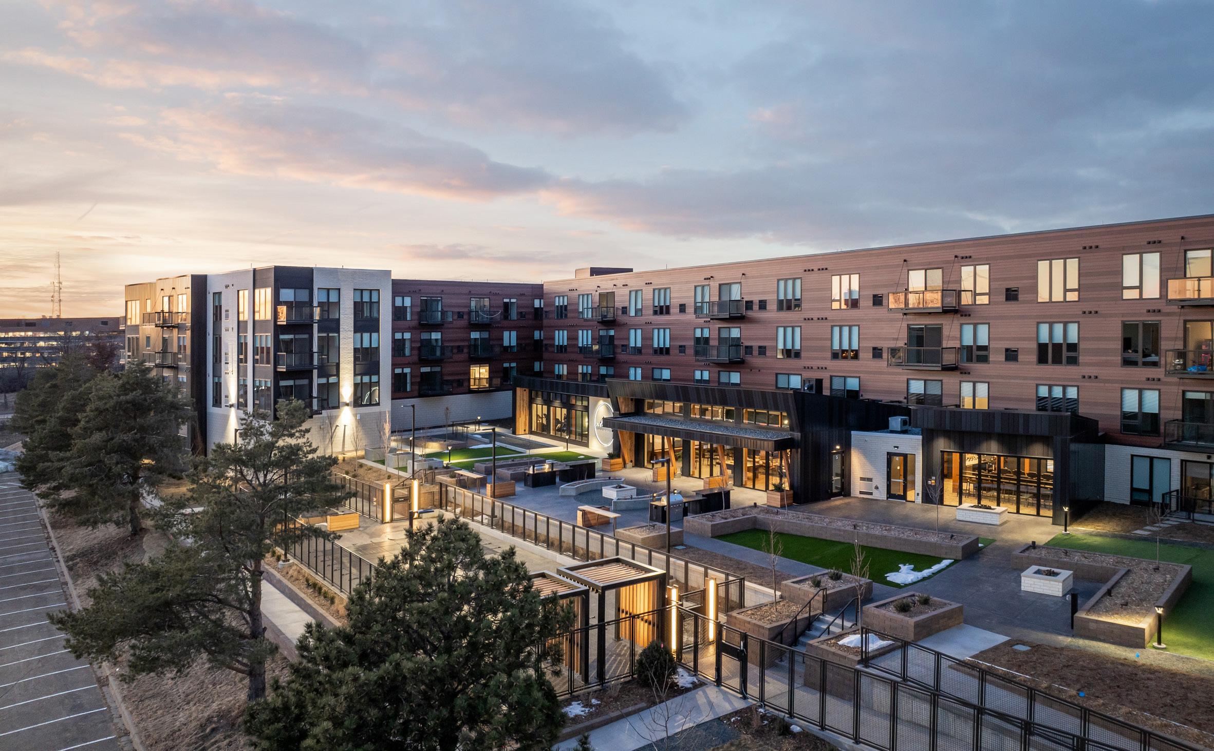 The development is designed to accommodate and respond to future growth around the Golden Triangle light-rail transit hub, which encourages walkability and connectivity. The multi-building design minimizes the building’s overall scale, enhancing natural light and transparency. The design also features courtyards at ground level and on rooftops, creating varied and engaging experiences within the space. Connectivity to nature is a key element with at grade experiences and amenities tied very closely to walking trails and the wetland edge for an active, natural experience. Residents have access to numerous amenities including a swimming pool, spa, sauna, grilling stations, a pergola/shade structure, gas fire pits, golf simulator, fitness center, private dining, pet spa, and a pickle ball court.