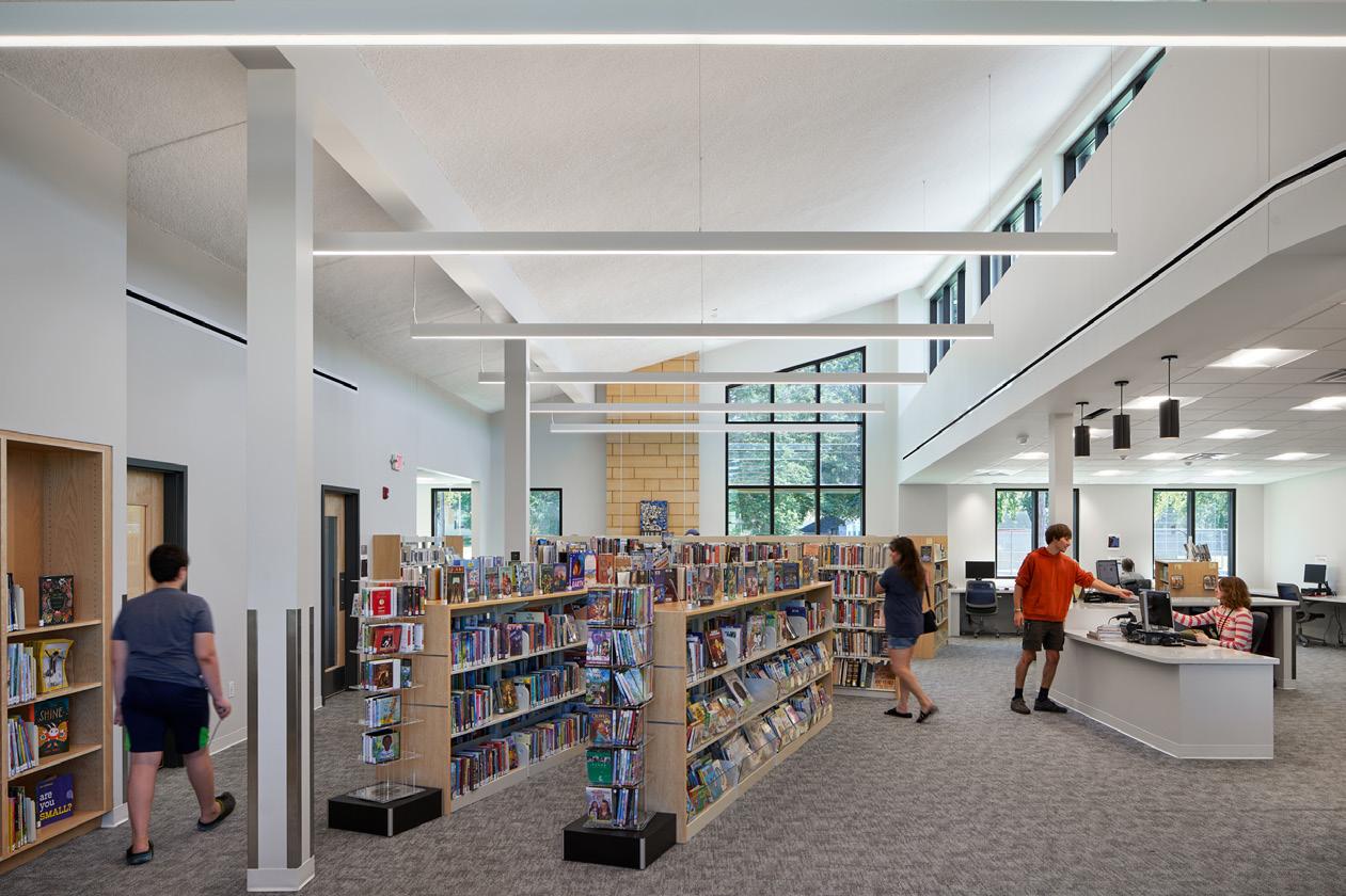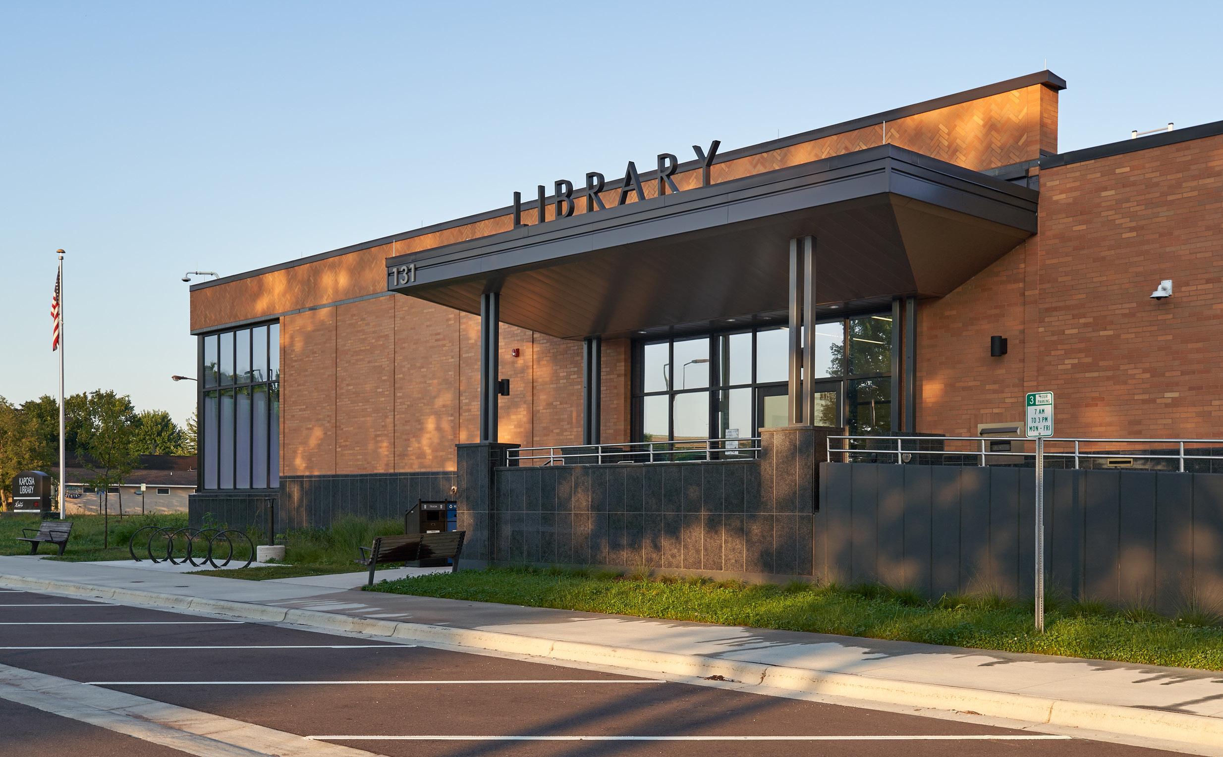 The exterior design takes inspiration from the adjacent elementary school, with a combination of brick and stone cladding, repeating pilasters at public lobby spaces, and a combination of pitched and flat roof element.