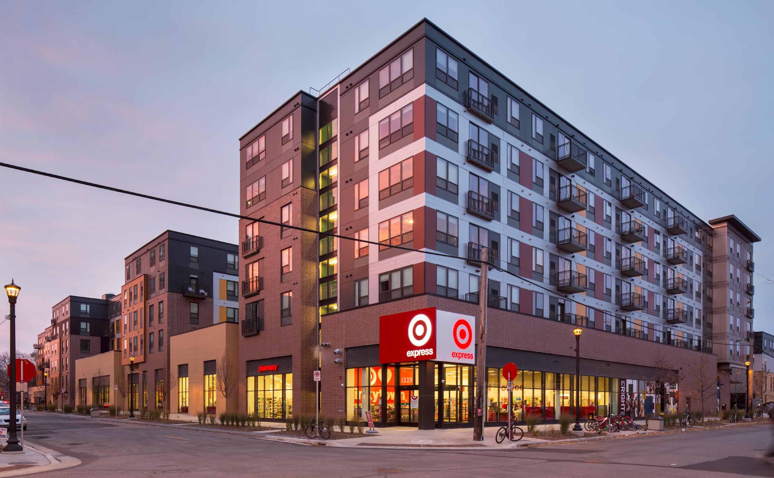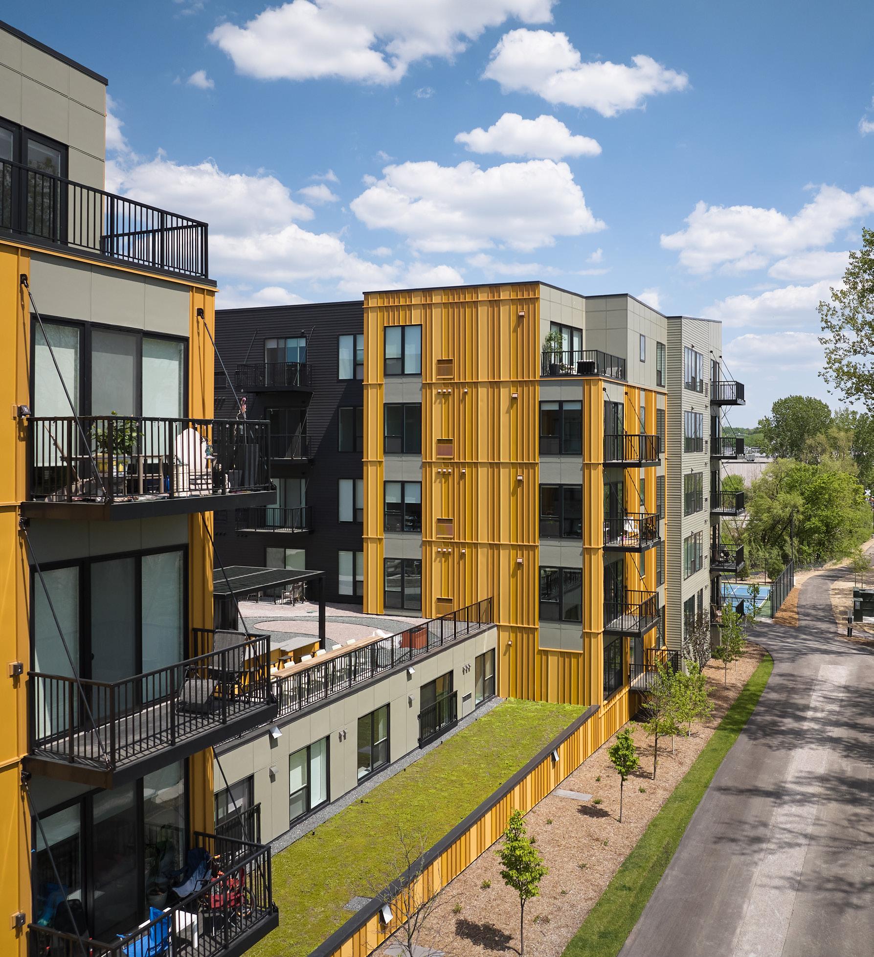 The Marshall is located just north of the University of Minnesota East Bank Campus in the Marcy-Holmes neighborhood of southeast Minneapolis. It includes retail and commercial space on the first floor and a series of walk-up townhome units on the ground floor, that allow residents to have direct access from the adjacent sidewalk.