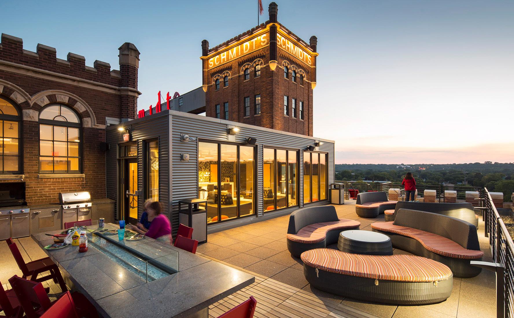 The Schmidt Artist Lofts is an adaptive reuse of the historic Schmidt Brewery in St. Paul, preserving the Brew House and Bottling House as key features of the Jacob Schmidt Brewing Company Historic District. The project restored the building’s exterior, including crenellated towers and Gothic details, and converted the site into 247 loft-style units plus 13 townhomes, totaling 260 residential units.