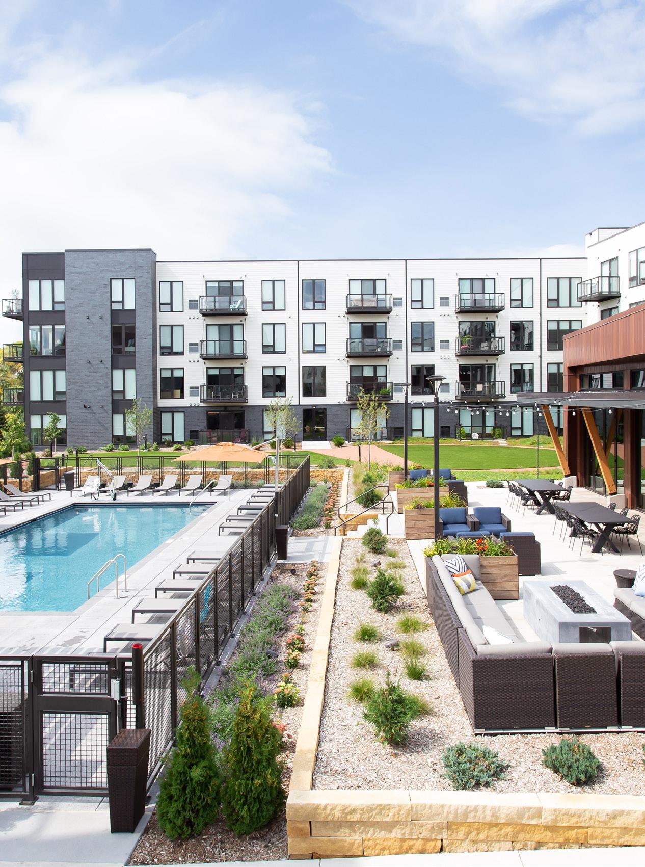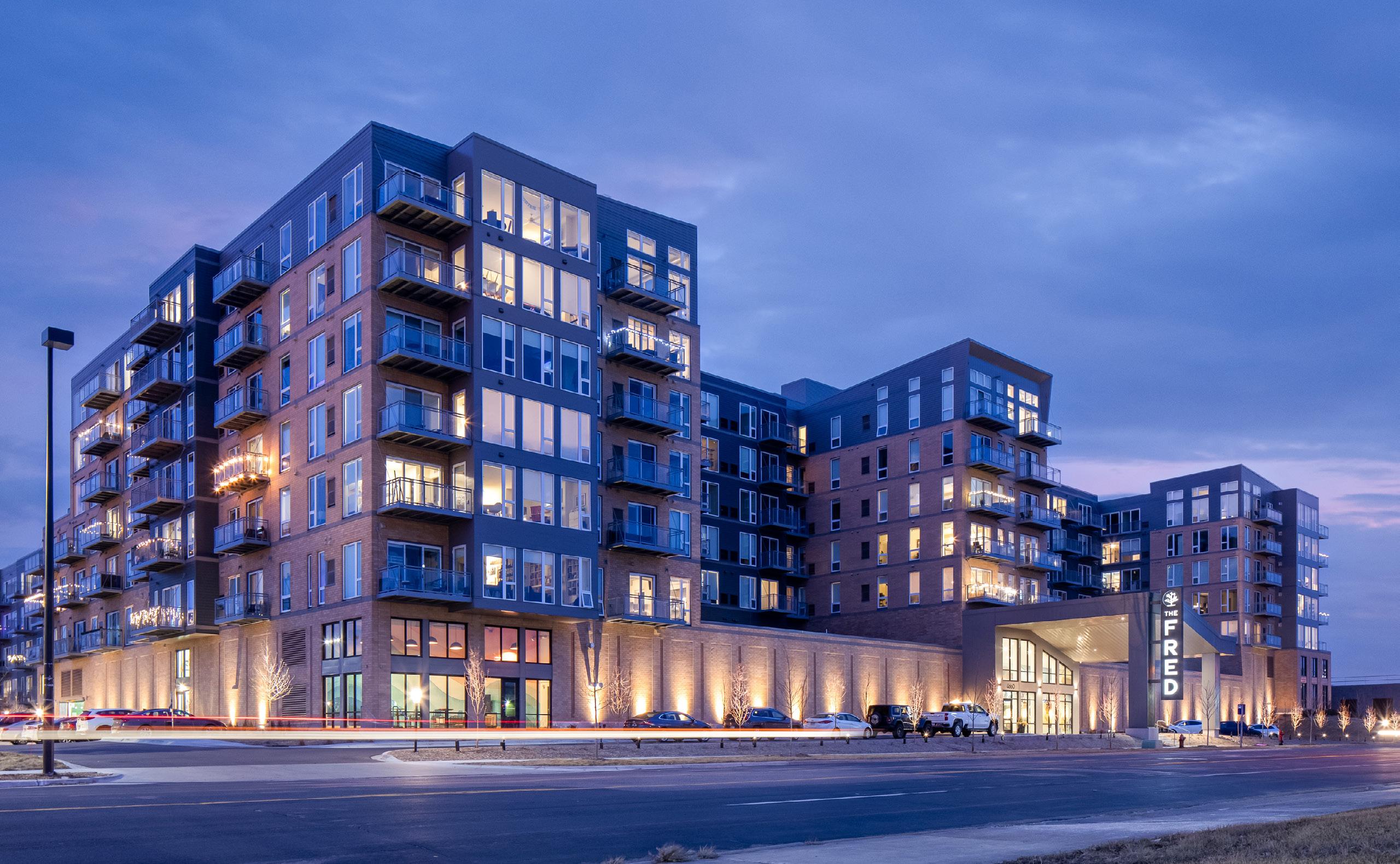 The Fred is a stunning, new, best-in-class development adjoining the beautiful Fred Richards Park in Edina. The building brings together resort style living, “work from home” unit layouts, and access to nature, light, and views in a dynamic location in the heart of the metro. Green space is the defining feature of this eight-story, 400+ unit apartment building in the heart of Edina. Amenities abound at The Fred including pool, hot tub, sauna, one of a kind indoor sport court, virtual reality golf and game simulator, state-of-the-art fitness center, outdoor turf racket-sport court, pub and clubhouse, rooftop patios and fire pits, private work from home spaces, skylounge chef’s kitchen, library, EV-friendly indoor parking, dog run, and extensive native landscaping. The Fred seamlessly blends the natural and the urbane, bringing together suburban convenience, resort-style living, and access to nature in one location.