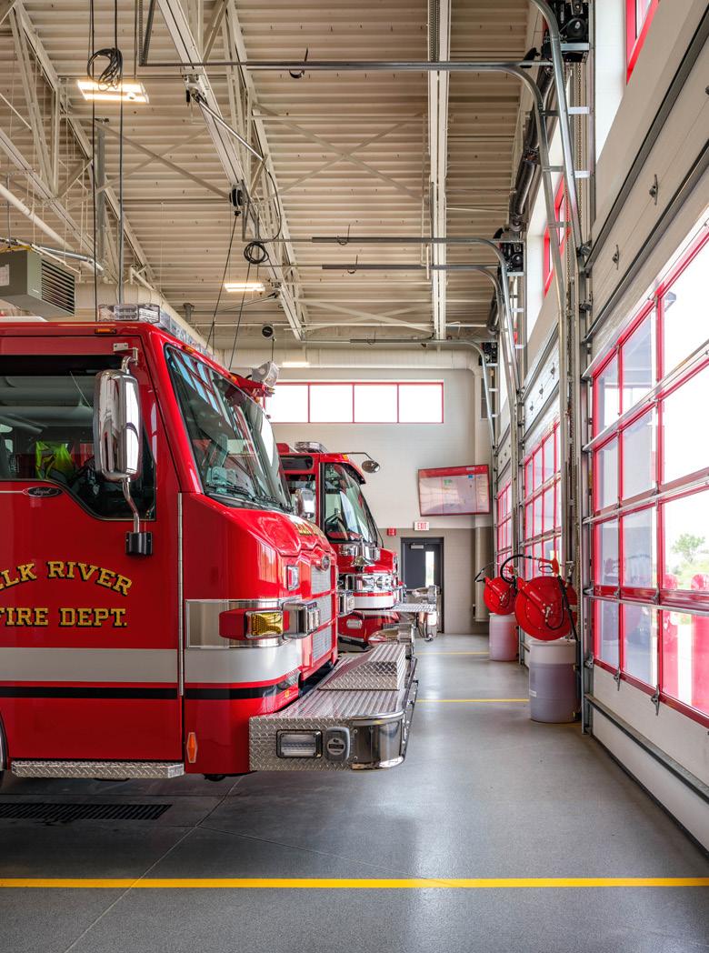 Currently a paid-on-call department, the City is looking to the future and planning for the potential conversion of office spaces into bunk rooms, planning the infrastructure and acoustic needs now. A safe workflow from emergency responder parking to the gear storage room to the apparatus is provided, as is a safe workflow from the future bunk rooms into the apparatus bays. The building is planned for additions to the bunk room area and to the apparatus bays.