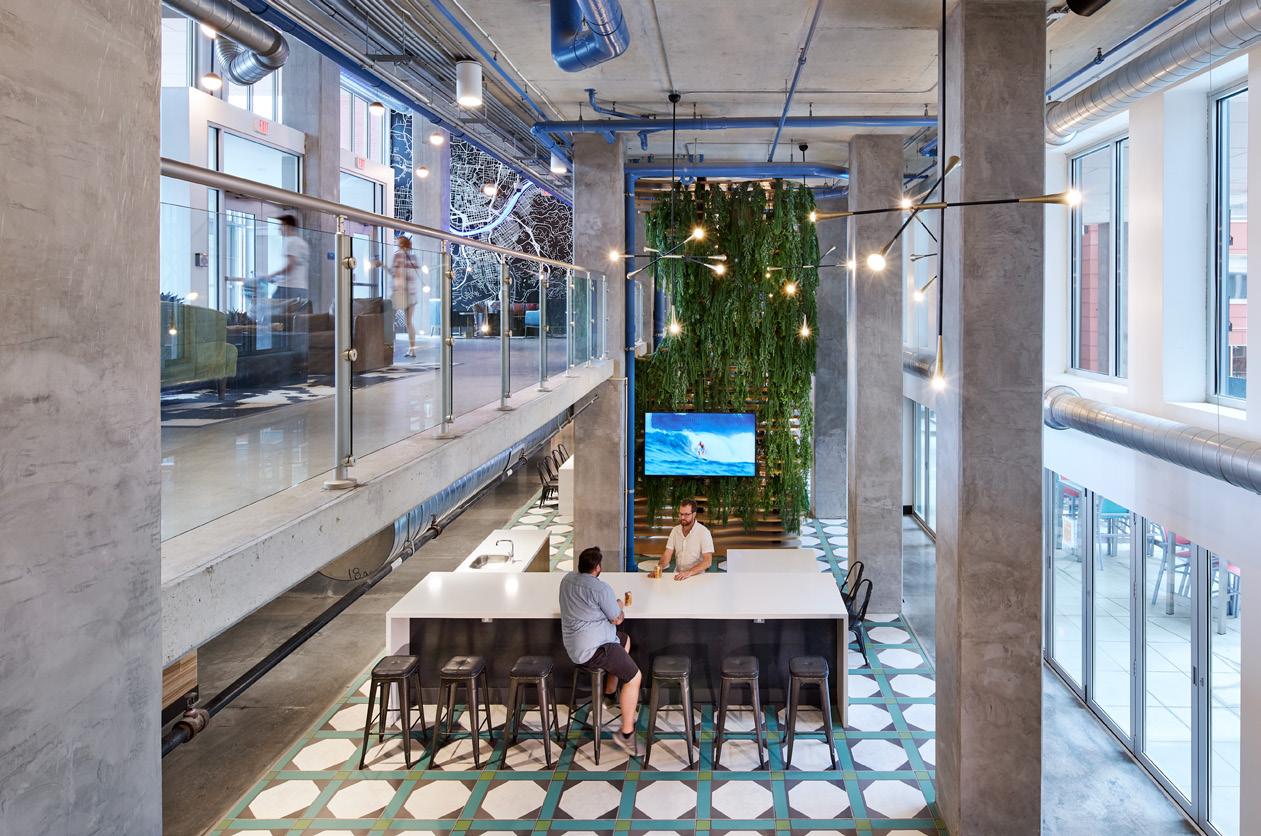 As a heavily amenitized, market-rate development containing micro-units, Sugar House features a variety of uses including maker space, retail pop-ups, and potentially a partnership with a local bicycle shop. While not zoned for commercial use, these spaces will be embedded in the final project, with both buildings uniquely featuring co-working spaces where communal working zones are paired with living and recreation spaces, establishing an immersive co-living environment including a central kitchen space and bowling alley – the latter of which was one of the original uses of the property.