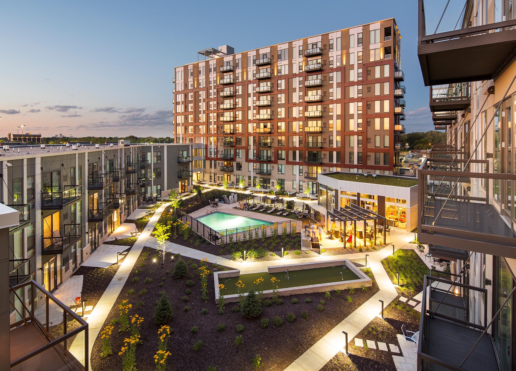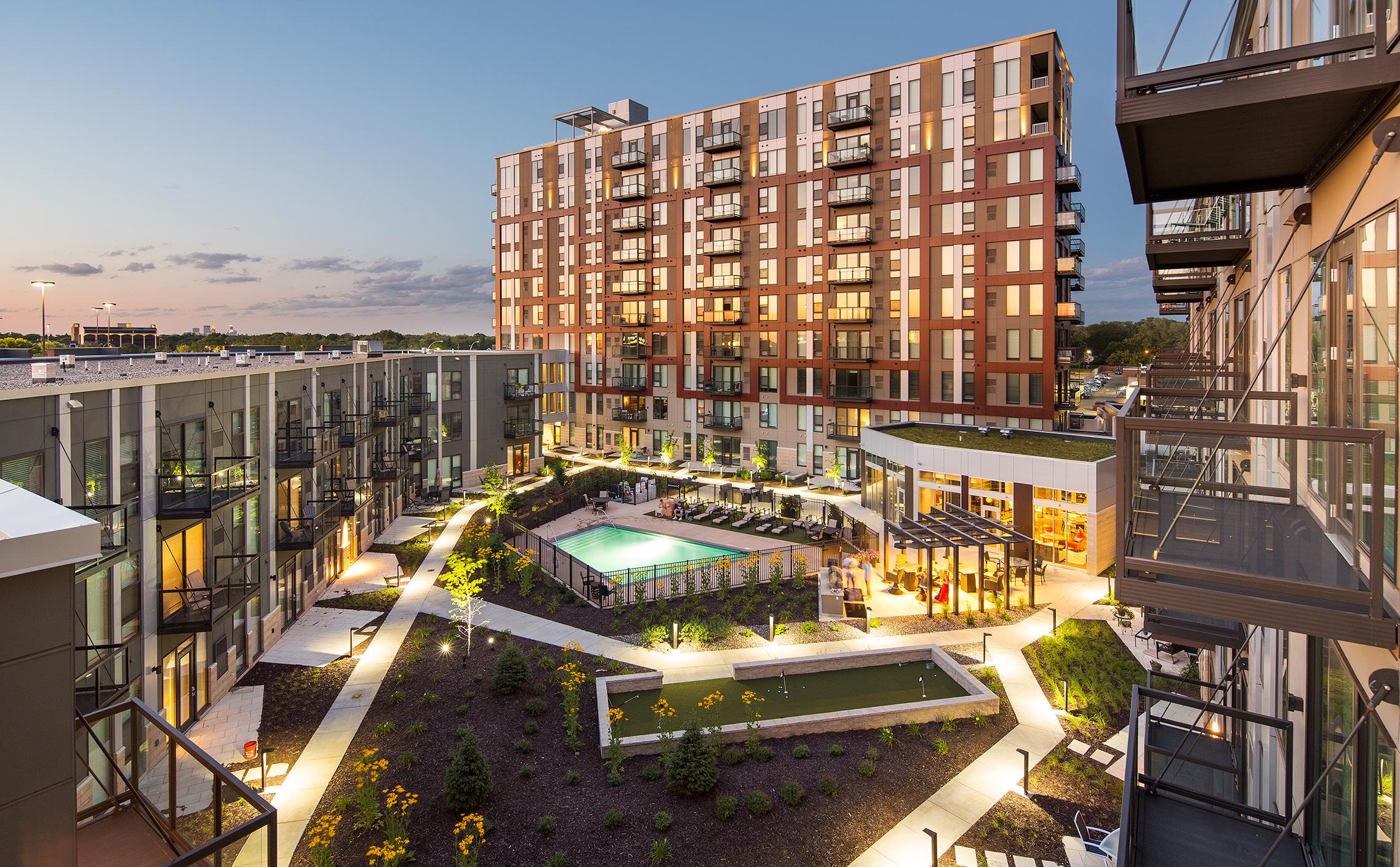 Resident amenities include a community room, rooftop terrace, outdoor pool, full fitness center, business center, underground heated parking, and landscaped walking paths with bocce courts. The project team also designed sustainable features such as green roof areas, a green courtyard, energy-efficient appliances, individual unit heating and cooling, and walkability with close proximity to transit. A primary goal was to create connectivity between the units, Southdale Mall, and the surrounding businesses. Walk-up apartments on the first floor with patios and new sidewalks help to create a neighborhood feel and sense of community.