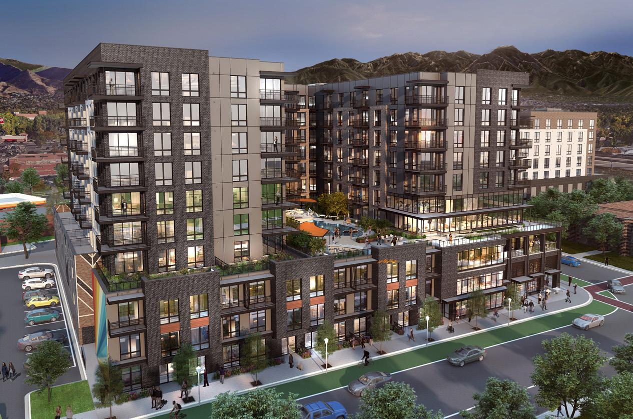 A high-end multifamily development featuring diverse unit types, premium amenities, sustainable design, and strong walkable connections to nearby retail and community spaces