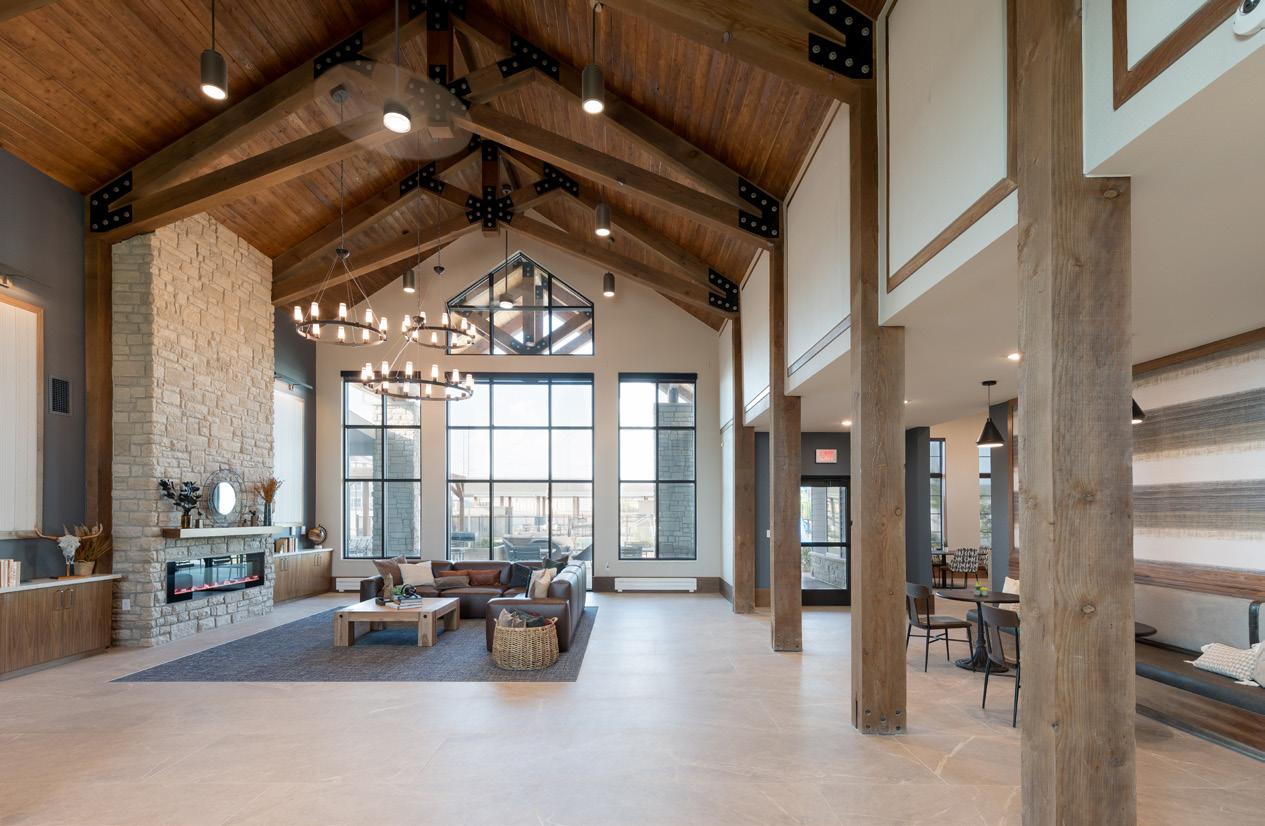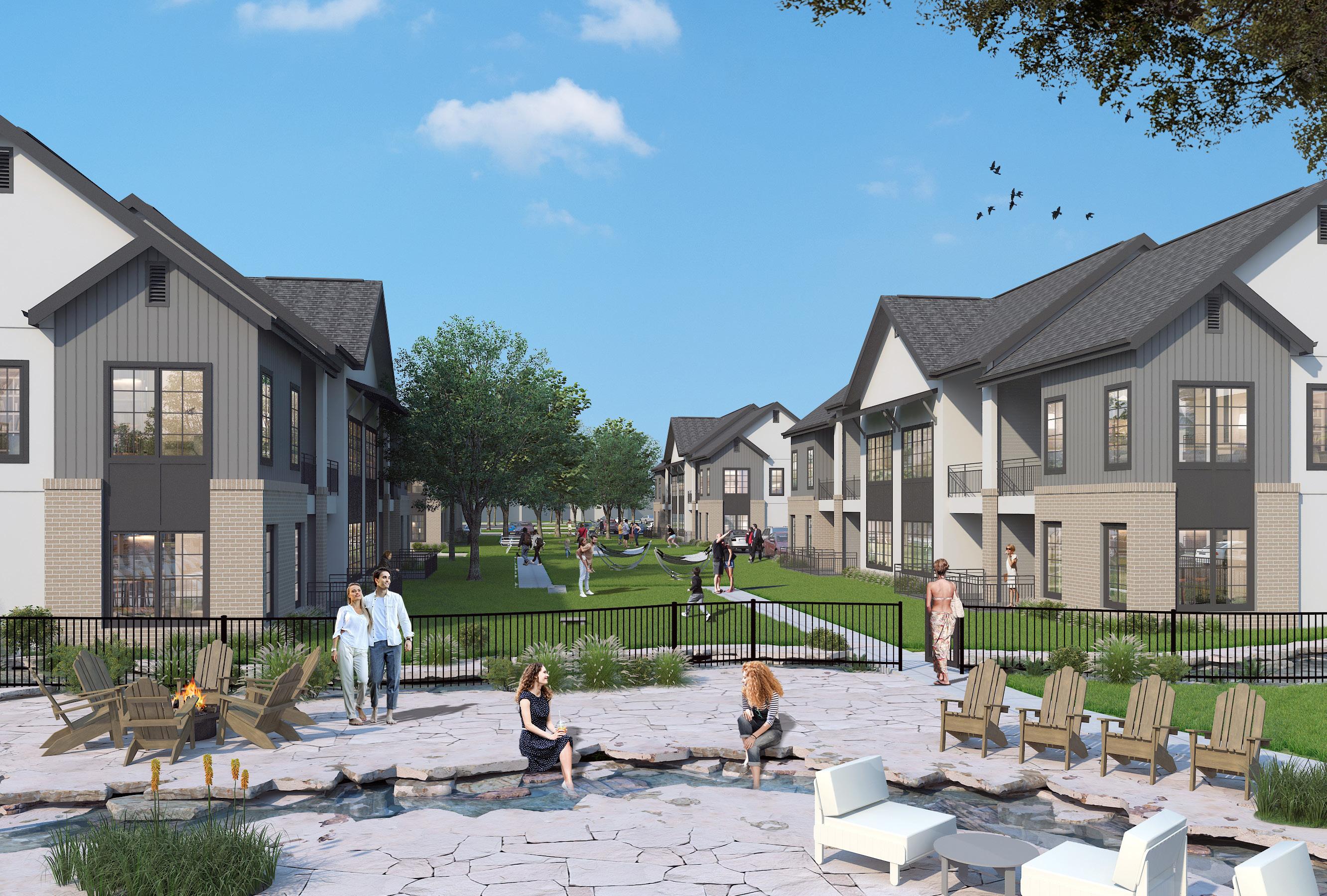 The proximity to the river and natural environment allows tenants to explore existing bike paths and access the river for leisurely activities such as kayaking, while providing adequate parking infrastructure for those who choose to commute to work. Amenities include outdoor swim spas and landscaped amenity deck with four-seasons porch, outdoor grilling stations, fire pit lounges, fitness center, yoga studio, resident lounge, dog spa, putting green, and bocce court.