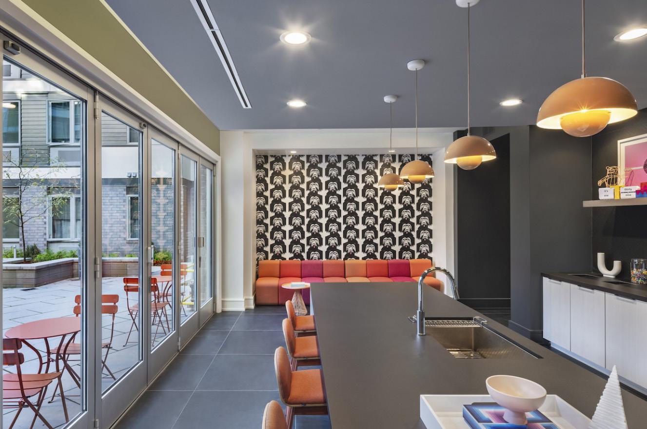 Amenities include a business center, clubroom, lounge, controlled entry, fitness center, laundry rooms, patio and grilling area, 231 below-grade parking spaces, bicycle storage, and the woonerf.