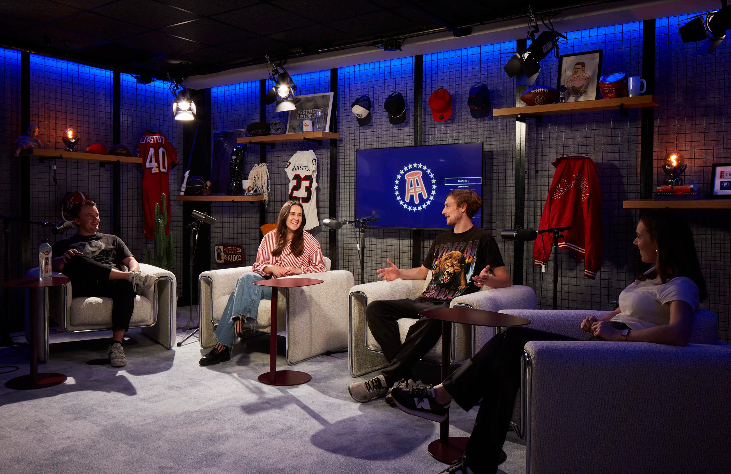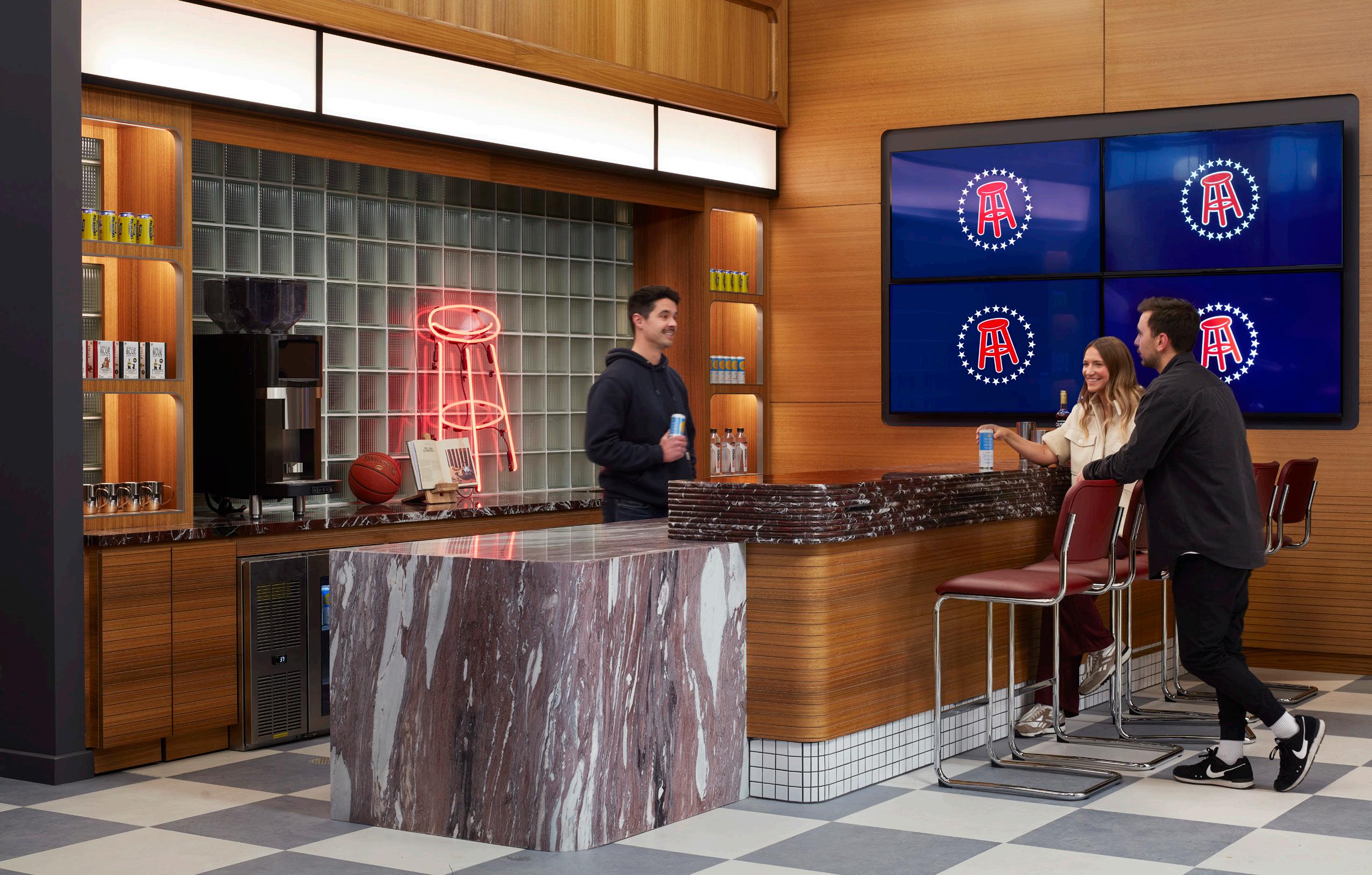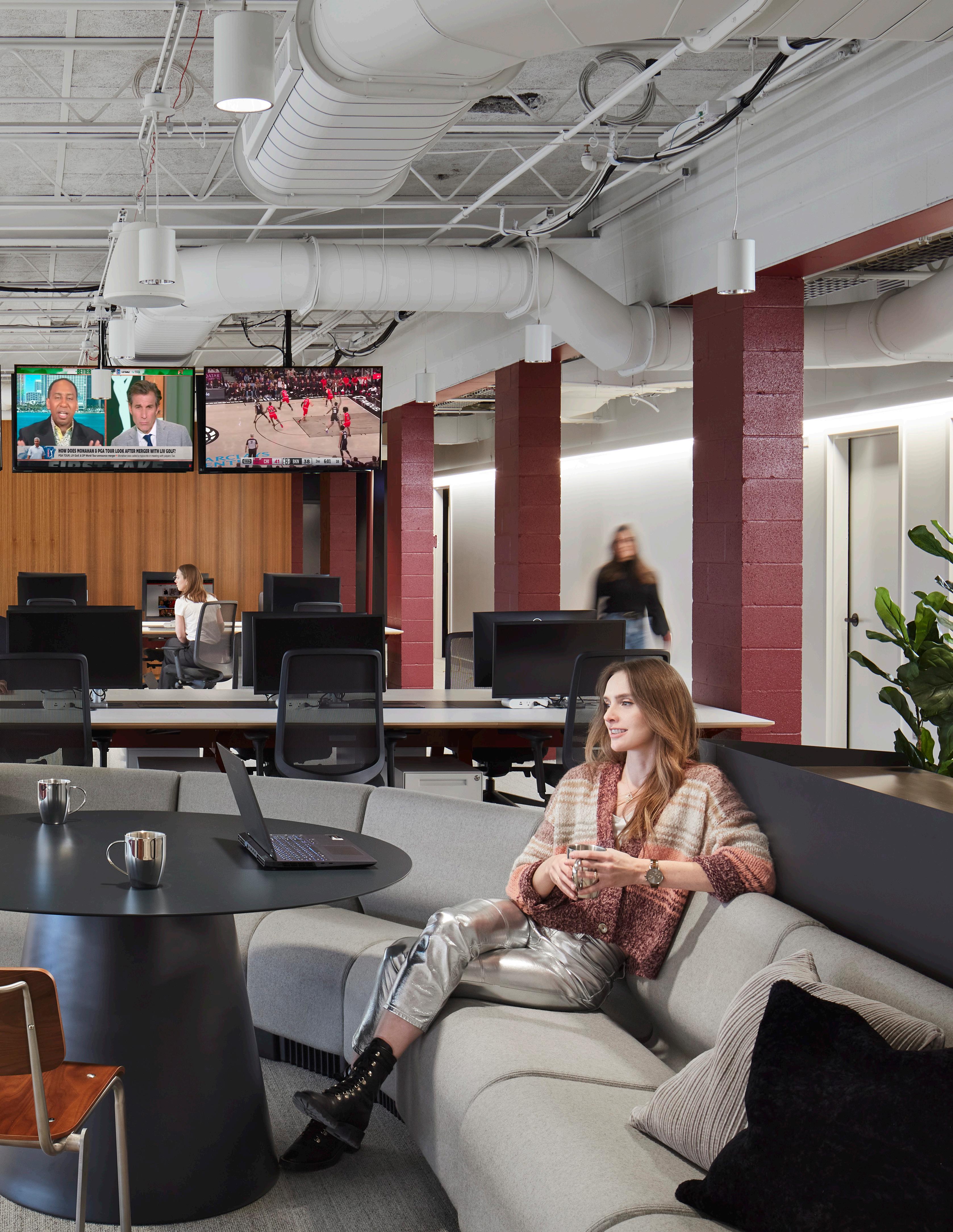 Enlisted to bring the concept to reality, BKV refurbished the entirety of the 33,000-square-foot, two-story loft space, which includes a dozen podcast studios, three large broadcast studios, a fully equipped commercial kitchen, full-length basketball court and open-office seating overlooking the court for the companies’ approximately 60 employees to work, create, mingle, and of course, play.
