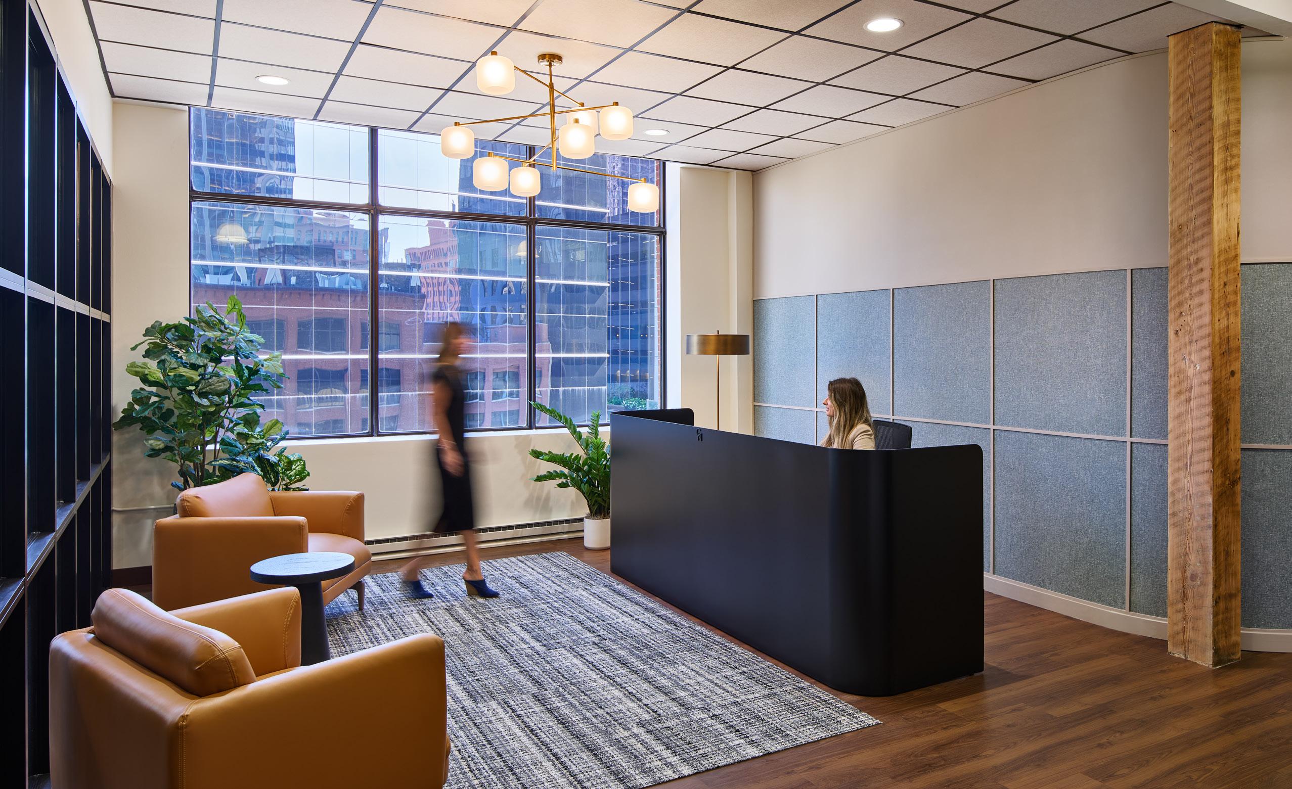 Law Office Crane & Norcross sought a new home, and they determined the top floor of one of the last brick and timber buildings within Chicago’s loop and along the river would be there new home The design team took charge to marry the industrial building’s mercantile history with the client’s straight-forward culture. The office refresh focused on provided Crane and Norcross more ideal open work lounge and collaborative space which would help enhance their work culture and cross departmental collaboration. The design team feather hospitality touches into the design with textured patterns, stylish and comfortable furniture, as well as interior planting.