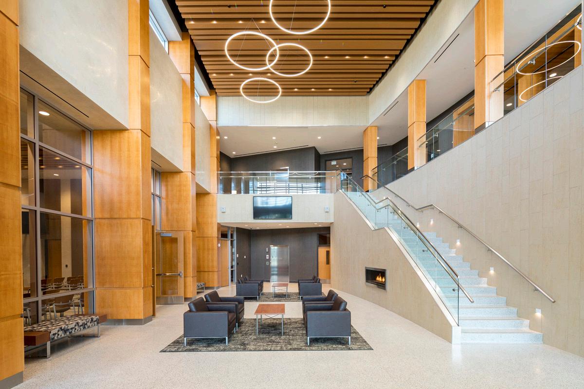 The building’s design responds to its urban and natural surroundings with a palate of materials that are both elemental and durable. Stone, brick, metal, wood, and glass create forms that emerge solid and straight, defining the building volumes on the site’s north and west boundaries. The civic campus is central feature in the larger Columbia Arena Redevelopment project.