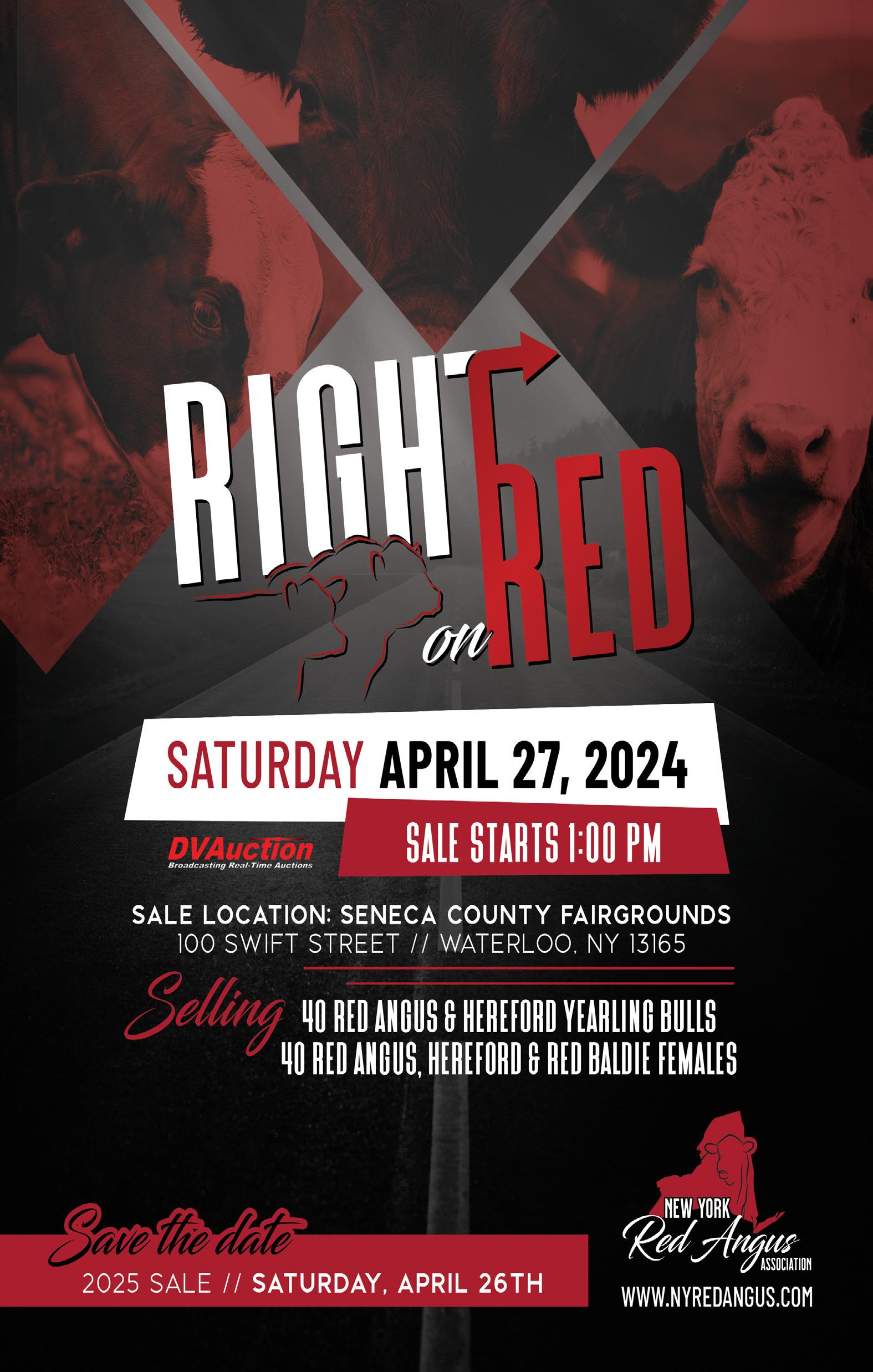From where I sit, there is no beter �me to be in the beef catle business, especially with Red Angus catle. The industry is posed for expansion, and the Red Angus breed has earned the respect of the en�re beef industry. Please consider reaching out to any one of the NYRAA officers, and see how you can be more directly involved with breed promo�on, marke�ng, leadership development, the bull and heifer development program, or the annual “Right on Red” Sale.