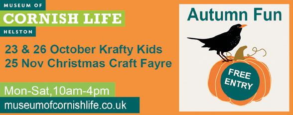 Penlee House Gallery & Museum, Penzance, 01736 363625. Free entry for children and Penzance residents see penleehouse. org.uk/penzance-pass. 2, 16, 30 Oct: free, baby play sessions, 10 to 11.30 am, explore sensory play in the gallery & experience amazing artworks. Every Saturday 2.30 to 3.30pm: drop-in family art activities, inspired by the exhibitions; FREE! 30 Sep: Lamorna Leaf Garlands, 7 Oct: Souvenirs from Penzance, 14 Oct: make rubbings from pilchard barrel stencils, 21 Oct: Colourful Troika geometric shapes, 28 Oct: create ceramic mosaic tiles inspired by Penlee’s piece of ancient Roman flooring from Pompeii; Nov dates: see website.