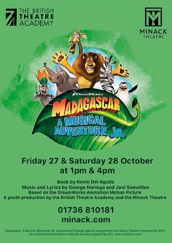 27 & 28 Oct at 1 & 4pm: Madagascar: A Musical Adventure Jr. A youth production by the British Theatre Academy & the Minack Theatre. Book by Kevin Del Aguila, music and score by George Noriega & Joel Someillan. Get a taste of the wild life with Alex the lion and his friends in this crazy adventure based on the DreamWorks animated motion picture. Alex is king of the urban jungle, but when Marty the Zebra escapes from the zoo with a boatload of penguins, it’s up to Alex, Melman the giraffe and Gloria the hippo to get them out of trouble. This production leaves you with no choice but to ‘Move It, Move It!’ Tickets from £10 (under 16s half price).