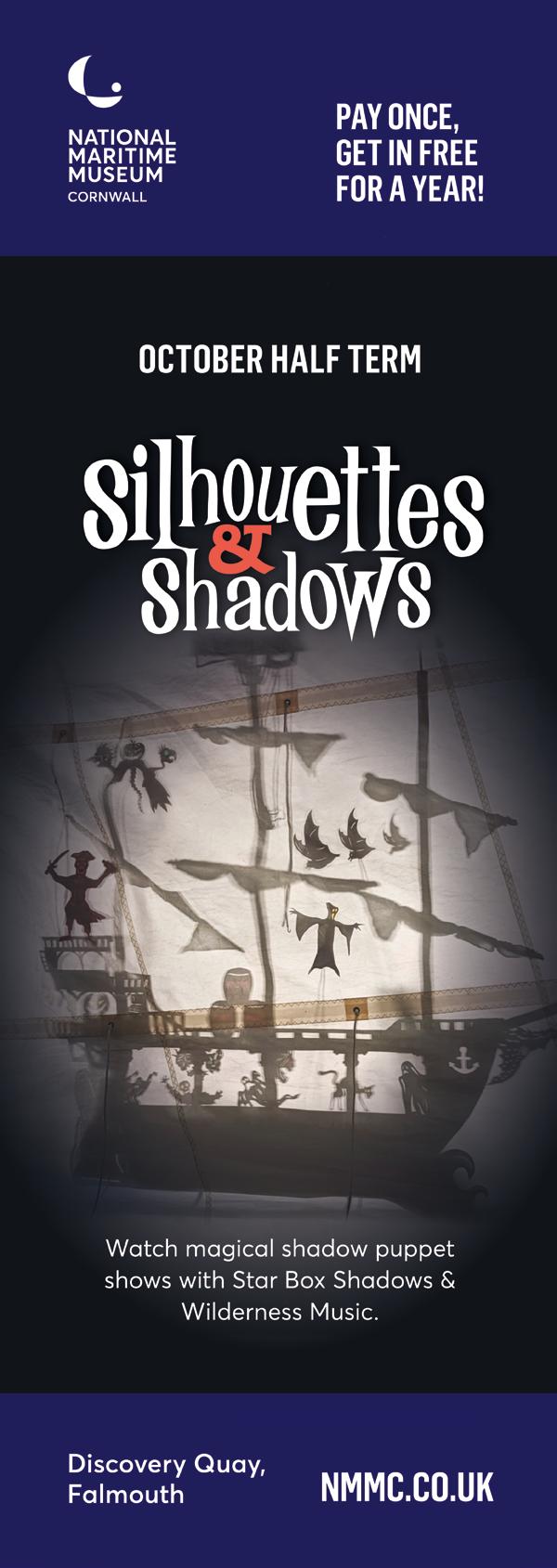 National Maritime Museum Cornwall, Falmouth. 21 to 29 Oct: Silhouettes & Shadows. The nights are drawing in and the shadows are taking over. This October half term take to the spooky high seas for eerie songs and ghostly shadow puppet stories in the Museum’s Main Hall, performed by Star Box Shadows and Wilderness Music. Then create shadow puppets in Make & Take and find hidden pirate ghosts on the Museum trail. Activities are FREE with the annual admission fee (pay once and get in free for a year). You can explore 15 galleries over four floors, jump aboard boats, climb the 100-foot Lookout Tower, watch boatbuilding, go underwater in the Tidal Zone, discover stories of ocean adventures and survival, and sail miniature boats on the waterfront boat pool.