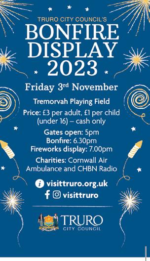 Truro City Council’s Bonfire Night display Friday 3 Nov at Tremorvah Playing Field. Gates open at 5pm, bonfire lit at 6.30pm, fireworks display at 7pm. £3 per adult, £1 under 16s, cash only; in aid of Cornwall Air Ambulance and CHBN Radio. ‘Best Guy Fawkes’ competition, and the best Guy will top the bonfire! Refreshments available to purchase. Limited parking. visittruro.org.uk Facebook/ Instagram – visittruro