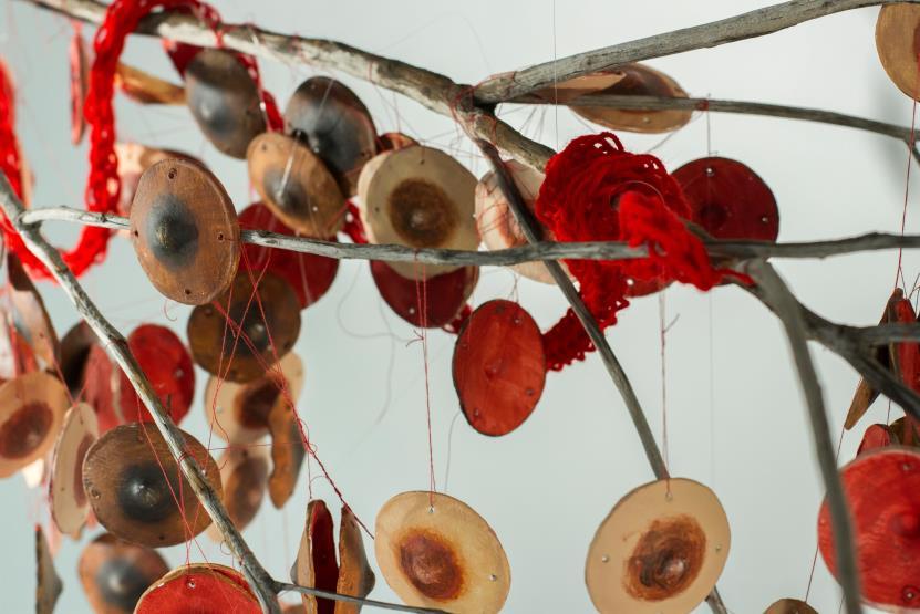Imagem: Fiamma Viola, Tramas Invisíveis (instalação: cerâmica pintada a mão, linha e galhos) Fotógrafo: Humberto Araújo