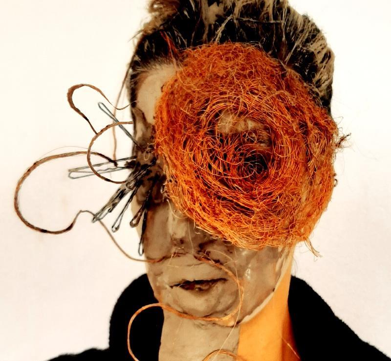 Todos somos um, Acrílica, carvão, linha, gaze e jornal sobre papelão corrugado, 95 x 75 cm, 2020