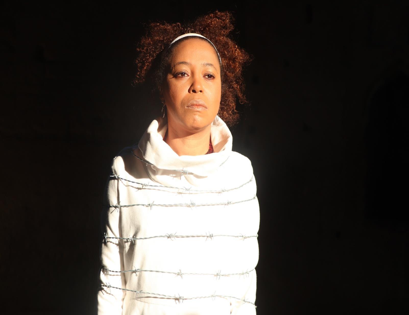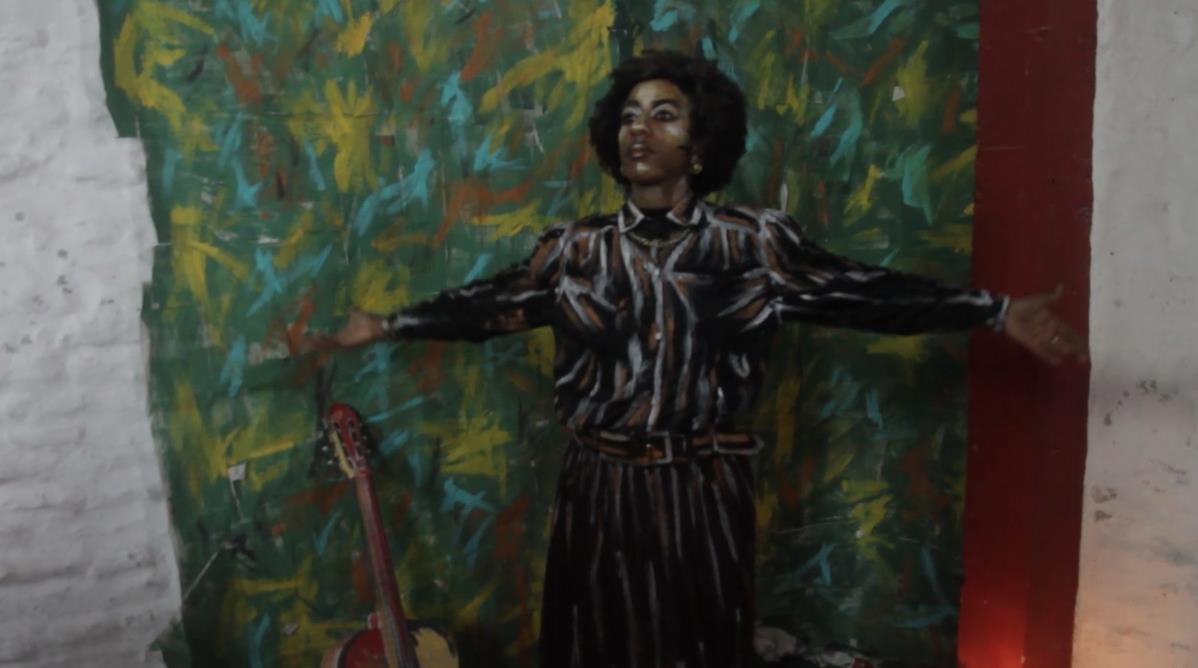 Ândrea Cordeiro, RJ Perdoando Deus?, Frame da vídeo performance (12’19’’), 2021 Texto: Clarice Lispector | Adaptação: Ândrea Cordeiro | Direção: Jorge Oliveira e Rita Dias | Direção: O Coletivo | Figurino: Lenise Cardoso | Cenografia: O Coletivo | Trilha: Nasnuven Paulo | Iluminação: Rita Dias