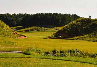 form a gate in front of the tee. You can send a very straight, low ball through the opening, or try to fly it over to the blind fairway. Into the wind, the ground route works—3-wood that lands before