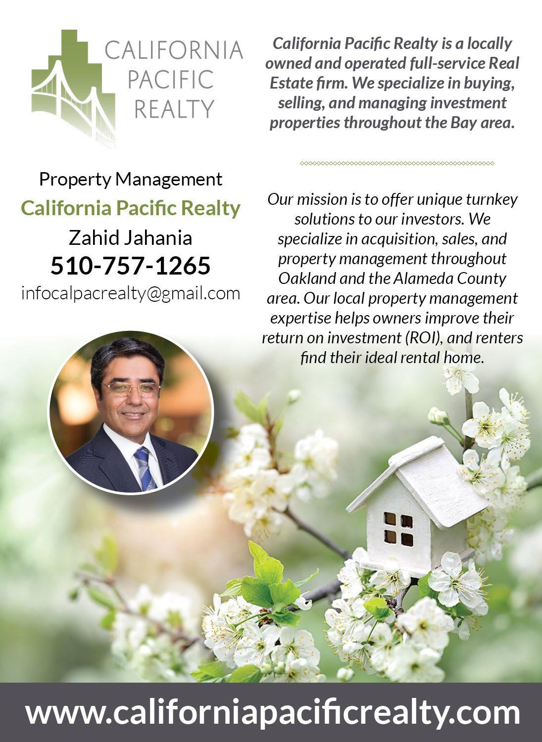 California Pacific Realty is a locally owned and operated full-service Real Estate firm. We specialize in buying, selling, and managing investment properties throughout the Bay area. Our mission is to offer unique turnkey solutions to our investors. We specialize in acquisition, sales, and property management throughout Oakland and the Alameda County area. Our local property management expertise helps owners improve their return on investment (ROI), and renters find their ideal rental home.