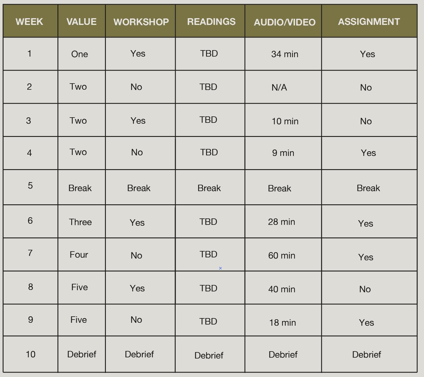 Each of the four values in the Crow Reader has a pre-recorded workshop (theory as a weapon, historical materialism, dialectics, and popular education). These workshops should be viewed every other week during the 9 week program.
