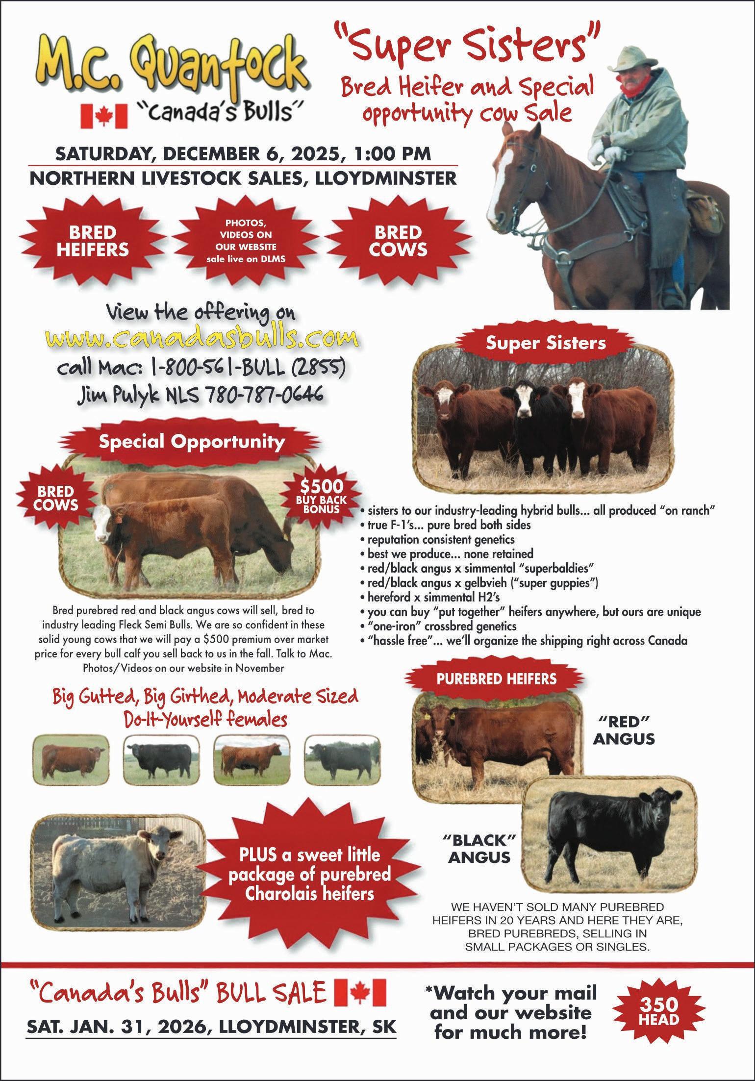 LocatedintheHeartofAlberta’sCattleFeedingIndustry.WhetherBuyingorSelling, Feeders,Fats,CullCows,callusforyourlivestockmarketingneedsincludingInternet. Wespecializeinmarketing,cattlecontracting,andcustomfeeding.Wealsooffera convenientcustomweightfacilityandtruckwash. 403-732-5644