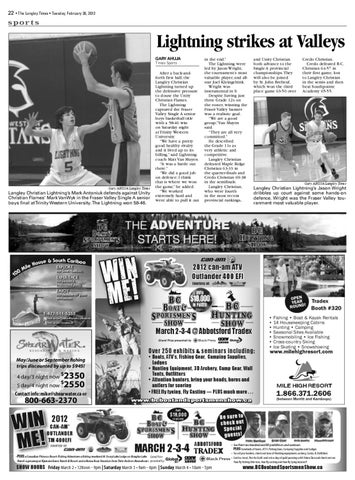 After a back-andforth first half, the Langley Christian Lightning turned up the defensive pressure to douse the Unity Christian Flames. The Lightning captured the Fraser Valley Single A senior boys basketball title with a 58-46 win on Saturday night at Trinity Western University. “We have a pretty good healthy rivalry and it lived up to its billing,� said Lightning coach Matt Van Muyen. “It was a battle out there.� “We did a good job on defence; I think that is where we won the game,� he added. “We worked extremely hard and were able to pull it out