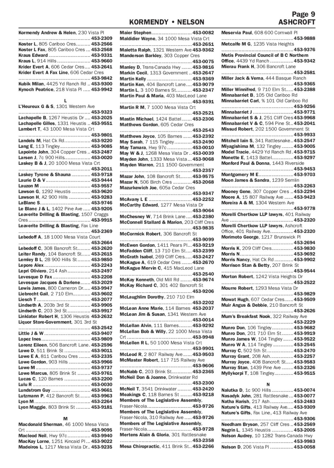 Maier Stephen............................. 453-0082 Maldidier Wayne, 34 1000 Mesa Vista Crt .................................................. 453-2651 Maletta Ralph, 1321 Western Ave.453-9362 Manderson Barkley, 303 Copper Cres .................................................. 453-0075 Manley D, Trans-Canada Hwy........ 453-9816 Markin Cecil, 1313 Government... 453-2647 Martin Kelly................................ 453-9369 Martin Ken, 404 Bancroft Lane..... 453-9079 Martin L, 3 100 Barnes St............ 453-2347 Martin Paul & Maria, 403 MacLeod Lane .................................................. 453-9391 Martin R M, 7 1000 Mesa Vista Crt .................................................. 453-2521 Mastin Michael, 1424 Battel........ 453-2306 Matthews Gordon, 605 Cedar Cres .................................................. 453-2543 Matthews Joyce, 105 Barnes....... 453-2392 May Sarah, 7 115 Tingley............. 453-2490 May Tamara, Hwy 97c.................. 453-0010 May W & J, 1268 Mesa Vista Dr... 453-0039 Mayden John, 1333 Mesa Vista.... 453-9068 Mayden Warren, 211 1500 Government .................................................. 453-2357 Mazar John, 108 Bancroft St......... 453-9575 Mazar N, 506 Birch Cres.............. 453-2068 Mazurkewich Joe, 605a Cedar Cres .................................................. 453-9347 McAvany L E............................... 453-2252 McCarthy Edward, 1277 Mesa Vista Dr .................................................. 453-9064 McChesney W, 714 Brink Lane..... 453-2380 McConnell Stallard & Marion, 203 Cliff Cres .................................................. 453-9835 McCormick Robert, 306 Bancroft St .................................................. 453-9099 McEwen Gordon, 1411 Pears Pl.... 453-9219 McFadden Cliff, 13 710 Elm St..... 453-2399 McGrath Isabel, 269 Cliff Cres..... 453-2427 McKague A, 619 Cedar Cres........ 453-2670 McKague Mervin C, 415 MacLeod Lane .................................................. 453-2540 McKay Kenneth, Old Mill Rd......... 453-9674 McKay Richard C, 301 402 Bancroft St .................................................. 453-9206 McLaughlim Dorothy, 210 710 Elm .................................................. 453-2202 McLean Anne Marie, 114 Barnes. 453-2037 McLean Jim & Susan, 1341 Western Ave .................................................. 453-0014 McLellan Alvin, 111 Barnes.......... 453-9292 McLellan Bob & Willy, 22 1000 Mesa Vista Crt.............................................. 453-9948 McLellen R L, 50 1000 Mesa Vista Crt .................................................. 453-9901 McLeod R, 2 807 Railway Ave....... 453-9503 McMaster Robert, 117 715 Railway Ave .................................................. 453-9606 McNabb C, 203 Brink St............... 453-2365 McNeil Don & Joanne, Drinkwater Rd .................................................. 453-2300 McNeil T, 3541 Drinkwater........... 453-2420 Meakings C, 118 Barnes St......... 453-9218 Members of The Legislative Assembly, Fraser-Nicola................................ 453-9726 Members of The Legislative Assembly, Fraser-Nicola, 310 Railway Ave...... 453-9726 Members of The Legislative Assembly, Fraser-Nicola................................ 453-9728 Mertens Alain & Gloria, 301 Rattlesnake .................................................. 453-2358 Mesa Chiropractic, 411 Brink St... 453-2266