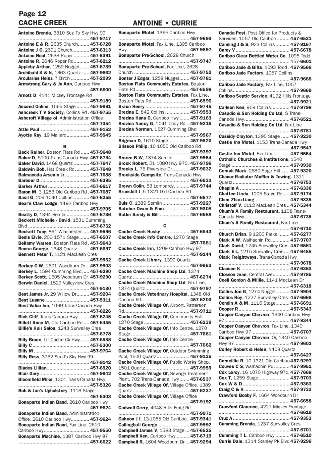 ANTOINE • CURRIE Bonaparte Motel, 1395 Cariboo Hwy .................................................. 457-9693 Bonaparte Motel, Fax Line, 1395 Cariboo Hwy............................................. 457-9697 Bonaparte Pre-School, 2628 Church .................................................. 457-9747 Bonaparte Pre-School, Fax Line, 2628 Church........................................ 457-9752 Bonter J Edgar, 1258 Nugget........ 457-9781 Boston Flats Community Estates, Boston Flats Rd....................................... 457-6598 Boston Flats Community Estates, Fax Line, Boston Flats Rd........................... 457-6596 Braun Henry................................ 457-9745 Brezina E, 842 Collins.................. 457-9553 Brezina Hans O, Cariboo Hwy........ 457-9163 Brezina Nancy G, 1041 Cody Rd... 457-9216 Brezina Norman, 1527 Cumming Blvd .................................................. 457-9567 Brigman D, 1610 Stage................ 457-9520 Brisson Philip, 10 1055 Old Cariboo Rd .................................................. 457-9397 Broere B W, 1374 Semlin............. 457-9954 Brook Robert, 21 1080 Hwy 97C.. 457-9796 Brooks L, 76 Riverside Dr............. 457-9632 Brookside Campsite, Trans-Canada Hwy .................................................. 457-6633 Brown Colin, 53 Lombardy............ 457-9744 Brunskill J, 5 1321 Old Cariboo Rd .................................................. 457-6677 Buis C, 1389 Semlin.................... 457-9227 Butcher Owen & Pam................... 457-9308 Butler Sandy & Bill...................... 457-6688 C Cache Creek Husky..................... 457-6643 Cache Creek Info Centre, 1270 Stage .................................................. 457-7661 Cache Creek Inn, 1209 Cariboo Hwy 97 .................................................. 457-9144 Cache Creek Library, 1390 Quartz .................................................. 457-9953 Cache Creek Machine Shop Ltd, 1374 Quartz......................................... 457-6274 Cache Creek Machine Shop Ltd, Fax Line, 1374 Quartz................................ 457-9797 Cache Creek Veterinary Hospital, 1348 Old Cariboo Rd.................................. 457-6203 Cache Creek Village Of, Airport, Patterson Rd............................................... 457-9711 Cache Creek Village Of, Community Hall, 1270 Stage................................. 457-6239 Cache Creek Village Of, Info Centre, 1270 Stage.......................................... 457-7661 Cache Creek Village Of, Info Centre .................................................. 457-7662 Cache Creek Village Of, Outdoor Swimming Pool, 1500 Quartz........................ 457-9135 Cache Creek Village Of, Public Works Shop, 1501 Quartz................................ 457-9955 Cache Creek Village Of, Sewage Treatment Plant, 702 Trans-Canada Hwy........ 457-6537 Cache Creek Village Of, Village Office, 1389 Quartz......................................... 457-6237 Cache Creek Village Of, Village Office .................................................. 457-9192 Cadwell Gerry, 4048 Hills Frntg Rd .................................................. 457-9971 Cahoon J I, 13-1055 Old Cariboo.. 457-9341 Callingbull George....................... 457-9992 Campbell James V, 1583 Stage.... 457-6525 Campbell Ken, Cariboo Hwy.......... 457-6719 Campbell R, 1604 Woodburn Dr.... 457-9294