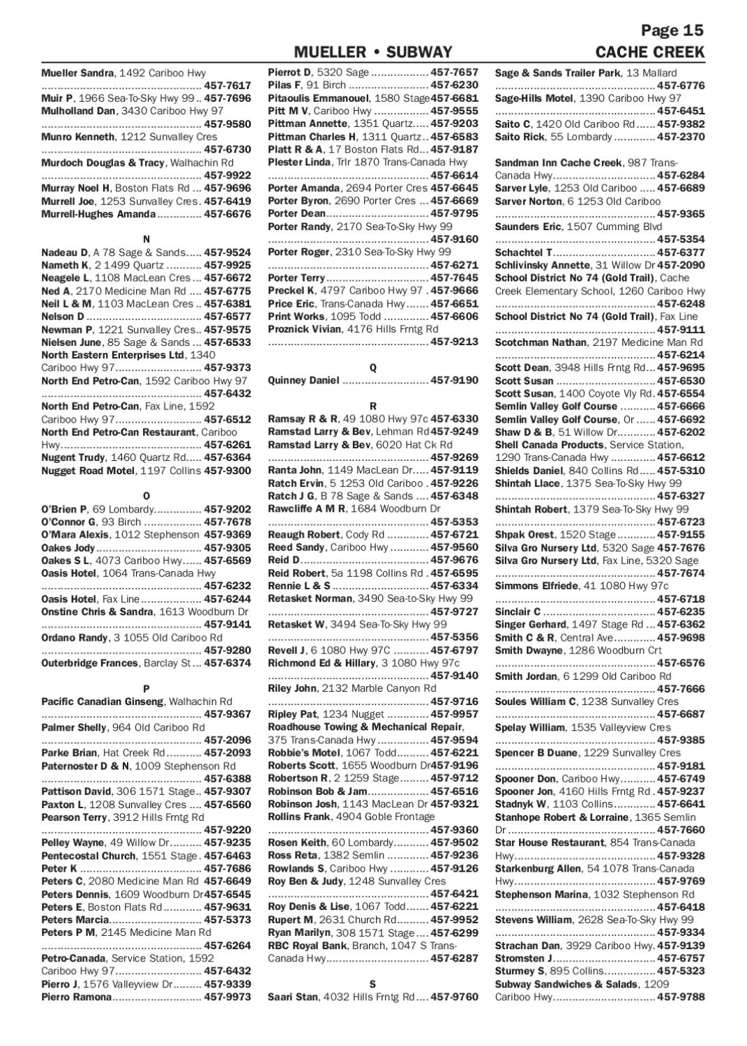 Pierrot D, 5320 Sage................... 457-7657 Pilas F, 91 Birch.......................... 457-6230 Pitaoulis Emmanouel, 1580 Stage.457-6681 Pitt M V, Cariboo Hwy.................. 457-9555 Pittman Annette, 1351 Quartz..... 457-9203 Pittman Charles H, 1311 Quartz... 457-6583 Platt R & A, 17 Boston Flats Rd.... 457-9187 Plester Linda, Trlr 1870 Trans-Canada Hwy .................................................. 457-6614 Porter Amanda, 2694 Porter Cres.457-6645 Porter Byron, 2690 Porter Cres.... 457-6669 Porter Dean................................. 457-9795 Porter Randy, 2170 Sea-To-Sky Hwy 99 .................................................. 457-9160 Porter Roger, 2310 Sea-To-Sky Hwy 99 .................................................. 457-6271 Porter Terry................................. 457-7645 Preckel K, 4797 Cariboo Hwy 97.. 457-9666 Price Eric, Trans-Canada Hwy........ 457-6651 Print Works, 1095 Todd............... 457-6606 Proznick Vivian, 4176 Hills Frntg Rd .................................................. 457-9213 Q Quinney Daniel............................ 457-9190 R Ramsay R & R, 49 1080 Hwy 97c.457-6330 Ramstad Larry & Bev, Lehman Rd.457-9249 Ramstad Larry & Bev, 6020 Hat Ck Rd .................................................. 457-9269 Ranta John, 1149 MacLean Dr...... 457-9119 Ratch Ervin, 5 1253 Old Cariboo.. 457-9226 Ratch J G, B 78 Sage & Sands..... 457-6348 Rawcliffe A M R, 1684 Woodburn Dr .................................................. 457-5353 Reaugh Robert, Cody Rd.............. 457-6721 Reed Sandy, Cariboo Hwy............. 457-9560 Reid D......................................... 457-9676 Reid Robert, 5a 1198 Collins Rd.. 457-6595 Rennie L & S............................... 457-6334 Retasket Norman, 3490 Sea-to-Sky Hwy 99 .................................................. 457-9727 Retasket W, 3494 Sea-To-Sky Hwy 99 .................................................. 457-5356 Revell J, 6 1080 Hwy 97C............ 457-6797 Richmond Ed & Hillary, 3 1080 Hwy 97c .................................................. 457-9140 Riley John, 2132 Marble Canyon Rd .................................................. 457-9716 Ripley Pat, 1234 Nugget.............. 457-9957 Roadhouse Towing & Mechanical Repair, 375 Trans-Canada Hwy................. 457-9594 Robbie’s Motel, 1067 Todd........... 457-6221 Roberts Scott, 1655 Woodburn Dr.457-9196 Robertson R, 2 1259 Stage.......... 457-9712 Robinson Bob & Jam.................... 457-6516 Robinson Josh, 1143 MacLean Dr.457-9321 Rollins Frank, 4904 Goble Frontage .................................................. 457-9360 Rosen Keith, 60 Lombardy............ 457-9502 Ross Reta, 1382 Semlin.............. 457-9236 Rowlands S, Cariboo Hwy............. 457-9126 Roy Ben & Judy, 1248 Sunvalley Cres .................................................. 457-6421 Roy Denis & Lise, 1067 Todd........ 457-6221 Rupert M, 2631 Church Rd........... 457-9952 Ryan Marilyn, 308 1571 Stage..... 457-6299 RBC Royal Bank, Branch, 1047 S TransCanada Hwy................................. 457-6287 S Saari Stan, 4032 Hills Frntg Rd..... 457-9760