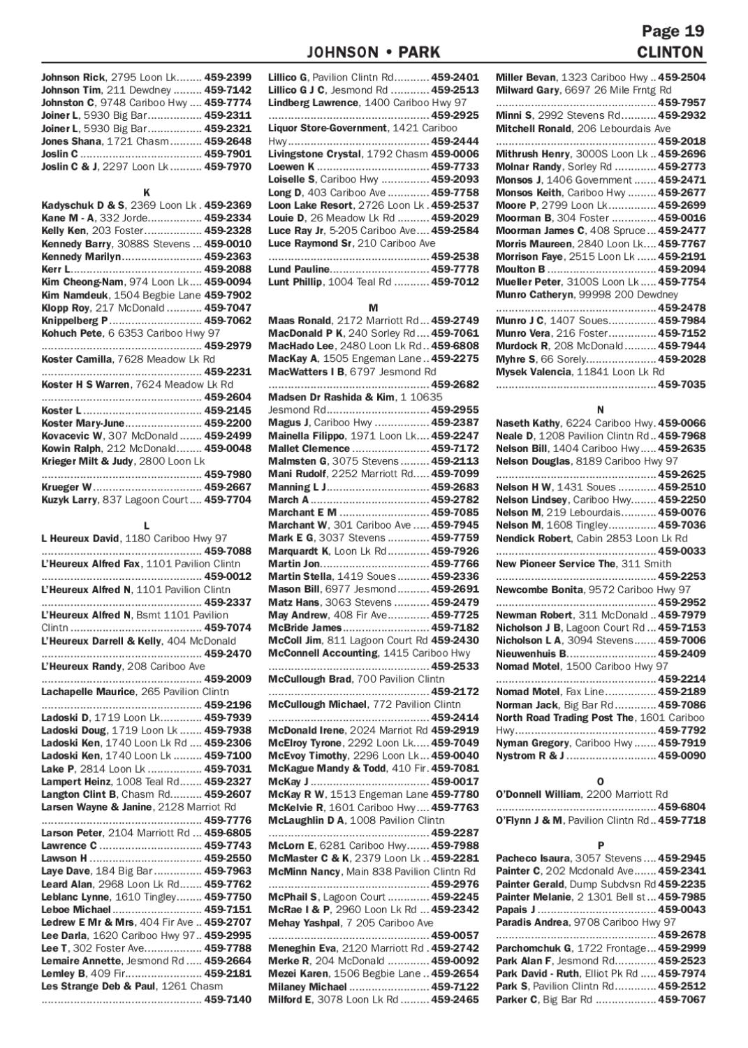 JOHNSON • Park Johnson Rick, 2795 Loon Lk......... 459-2399 Johnson Tim, 211 Dewdney.......... 459-7142 Johnston C, 9748 Cariboo Hwy..... 459-7774 Joiner L, 5930 Big Bar.................. 459-2311 Joiner L, 5930 Big Bar.................. 459-2321 Jones Shana, 1721 Chasm........... 459-2648 Joslin C....................................... 459-7901 Joslin C & J, 2297 Loon Lk........... 459-7970 K Kadyschuk D & S, 2369 Loon Lk.. 459-2369 Kane M - A, 332 Jorde................. 459-2334 Kelly Ken, 203 Foster................... 459-2328 Kennedy Barry, 3088S Stevens.... 459-0010 Kennedy Marilyn.......................... 459-2363 Kerr L.......................................... 459-2088 Kim Cheong-Nam, 974 Loon Lk..... 459-0094 Kim Namdeuk, 1504 Begbie Lane.459-7902 Klopp Roy, 217 McDonald............ 459-7047 Knippelberg P.............................. 459-7062 Kohuch Pete, 6 6353 Cariboo Hwy 97 .................................................. 459-2979 Koster Camilla, 7628 Meadow Lk Rd .................................................. 459-2231 Koster H S Warren, 7624 Meadow Lk Rd .................................................. 459-2604 Koster L...................................... 459-2145 Koster Mary-June......................... 459-2200 Kovacevic W, 307 McDonald........ 459-2499 Kowin Ralph, 212 McDonald......... 459-0048 Krieger Milt & Judy, 2800 Loon Lk .................................................. 459-7980 Krueger W................................... 459-2667 Kuzyk Larry, 837 Lagoon Court..... 459-7704 L L Heureux David, 1180 Cariboo Hwy 97 .................................................. 459-7088 L’Heureux Alfred Fax, 1101 Pavilion Clintn .................................................. 459-0012 L’Heureux Alfred N, 1101 Pavilion Clintn .................................................. 459-2337 L’Heureux Alfred N, Bsmt 1101 Pavilion Clintn.......................................... 459-7074 L’Heureux Darrell & Kelly, 404 McDonald .................................................. 459-2470 L’Heureux Randy, 208 Cariboo Ave .................................................. 459-2009 Lachapelle Maurice, 265 Pavilion Clintn .................................................. 459-2196 Ladoski D, 1719 Loon Lk.............. 459-7939 Ladoski Doug, 1719 Loon Lk........ 459-7938 Ladoski Ken, 1740 Loon Lk Rd..... 459-2306 Ladoski Ken, 1740 Loon Lk.......... 459-7100 Lake P, 2814 Loon Lk.................. 459-7031 Lampert Heinz, 1008 Teal Rd........ 459-2327 Langton Clint B, Chasm Rd.......... 459-2607 Larsen Wayne & Janine, 2128 Marriot Rd .................................................. 459-7776 Larson Peter, 2104 Marriott Rd.... 459-6805 Lawrence C................................. 459-7743 Lawson H.................................... 459-2550 Laye Dave, 184 Big Bar................ 459-7963 Leard Alan, 2968 Loon Lk Rd........ 459-7762 Leblanc Lynne, 1610 Tingley......... 459-7750 Leboe Michael............................. 459-7151 Ledrew E Mr & Mrs, 404 Fir Ave... 459-2707 Lee Darla, 1620 Cariboo Hwy 97... 459-2995 Lee T, 302 Foster Ave................... 459-7788 Lemaire Annette, Jesmond Rd...... 459-2664 Lemley B, 409 Fir......................... 459-2181 Les Strange Deb & Paul, 1261 Chasm .................................................. 459-7140