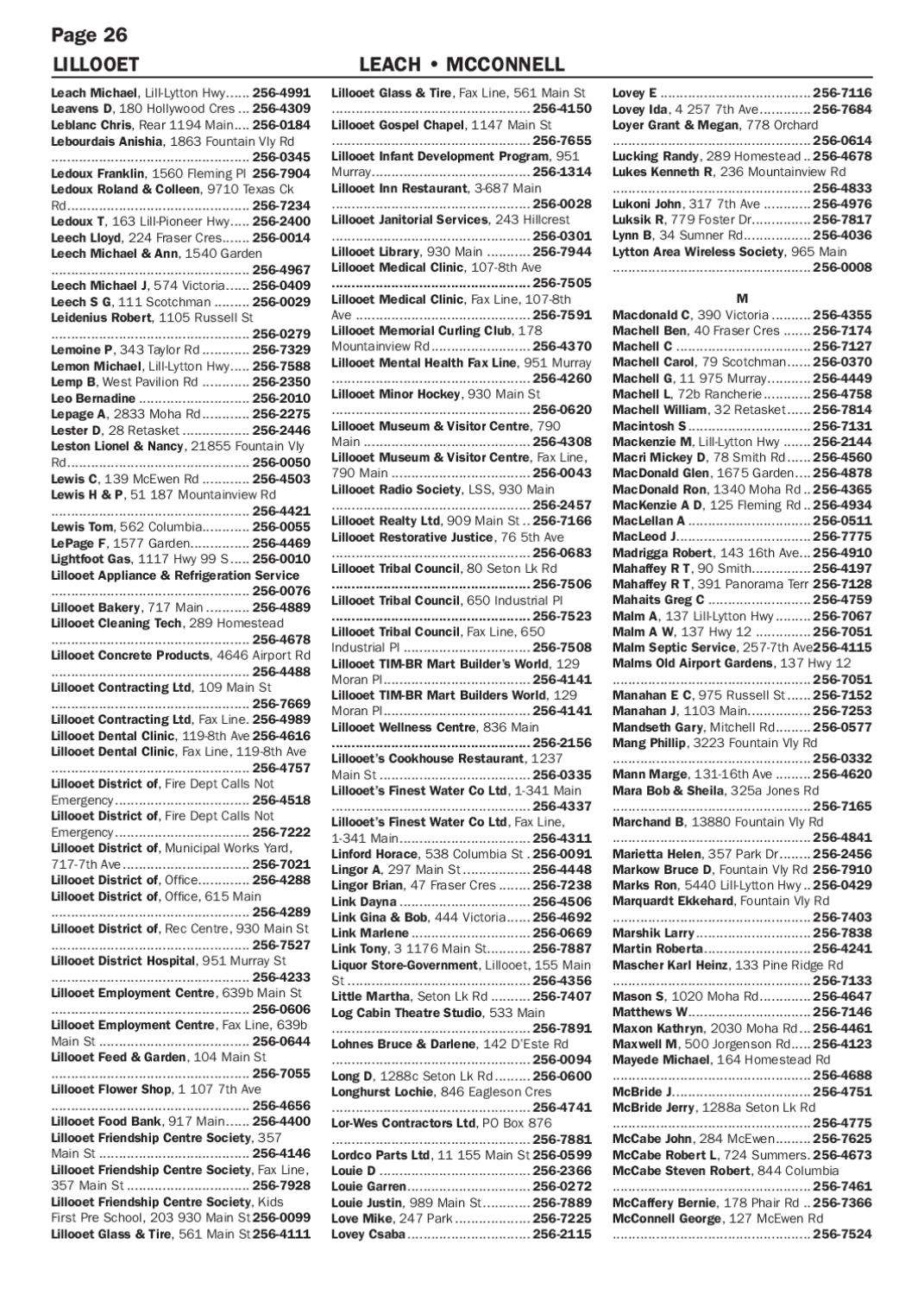 Lovey E....................................... 256-7116 Lovey Ida, 4 257 7th Ave.............. 256-7684 Loyer Grant & Megan, 778 Orchard .................................................. 256-0614 Lucking Randy, 289 Homestead... 256-4678 Lukes Kenneth R, 236 Mountainview Rd .................................................. 256-4833 Lukoni John, 317 7th Ave............. 256-4976 Luksik R, 779 Foster Dr............... 256-7817 Lynn B, 34 Sumner Rd.................. 256-4036 Lytton Area Wireless Society, 965 Main .................................................. 256-0008 M Macdonald C, 390 Victoria........... 256-4355 Machell Ben, 40 Fraser Cres........ 256-7174 Machell C................................... 256-7127 Machell Carol, 79 Scotchman....... 256-0370 Machell G, 11 975 Murray............ 256-4449 Machell L, 72b Rancherie............. 256-4758 Machell William, 32 Retasket....... 256-7814 Macintosh S................................ 256-7131 Mackenzie M, Lill-Lytton Hwy........ 256-2144 Macri Mickey D, 78 Smith Rd....... 256-4560 MacDonald Glen, 1675 Garden..... 256-4878 MacDonald Ron, 1340 Moha Rd... 256-4365 MacKenzie A D, 125 Fleming Rd... 256-4934 MacLellan A................................ 256-0511 MacLeod J................................... 256-7775 Madrigga Robert, 143 16th Ave... 256-4910 Mahaffey R T, 90 Smith................ 256-4197 Mahaffey R T, 391 Panorama Terr.256-7128 Mahaits Greg C........................... 256-4759 Malm A, 137 Lill-Lytton Hwy.......... 256-7067 Malm A W, 137 Hwy 12............... 256-7051 Malm Septic Service, 257-7th Ave.256-4115 Malms Old Airport Gardens, 137 Hwy 12 .................................................. 256-7051 Manahan E C, 975 Russell St....... 256-7152 Manahan J, 1103 Main................ 256-7253 Mandseth Gary, Mitchell Rd.......... 256-0577 Mang Phillip, 3223 Fountain Vly Rd .................................................. 256-0332 Mann Marge, 131-16th Ave.......... 256-4620 Mara Bob & Sheila, 325a Jones Rd .................................................. 256-7165 Marchand B, 13880 Fountain Vly Rd .................................................. 256-4841 Marietta Helen, 357 Park Dr......... 256-2456 Markow Bruce D, Fountain Vly Rd. 256-7910 Marks Ron, 5440 Lill-Lytton Hwy... 256-0429 Marquardt Ekkehard, Fountain Vly Rd .................................................. 256-7403 Marshik Larry.............................. 256-7838 Martin Roberta............................ 256-4241 Mascher Karl Heinz, 133 Pine Ridge Rd .................................................. 256-7133 Mason S, 1020 Moha Rd.............. 256-4647 Matthews W................................ 256-7146 Maxon Kathryn, 2030 Moha Rd.... 256-4461 Maxwell M, 500 Jorgenson Rd...... 256-4123 Mayede Michael, 164 Homestead Rd .................................................. 256-4688 McBride J.................................... 256-4751 McBride Jerry, 1288a Seton Lk Rd .................................................. 256-4775 McCabe John, 284 McEwen.......... 256-7625 McCabe Robert L, 724 Summers.. 256-4673 McCabe Steven Robert, 844 Columbia .................................................. 256-7461 McCaffery Bernie, 178 Phair Rd... 256-7366 McConnell George, 127 McEwen Rd .................................................. 256-7524