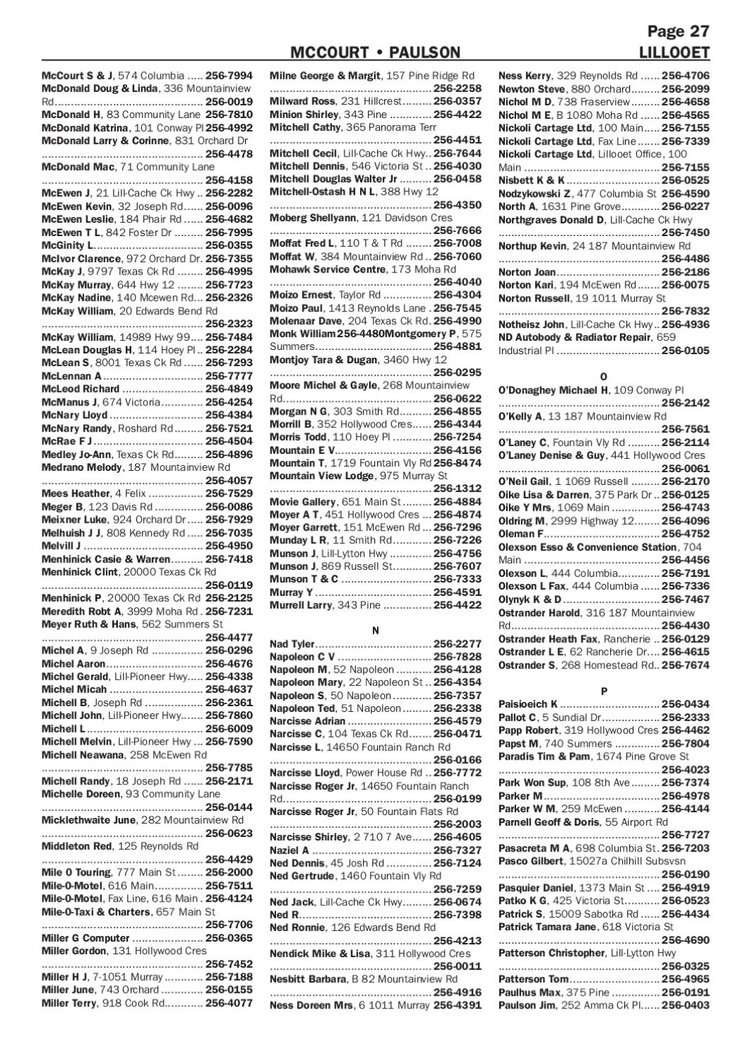 McCOURT • PAULSON McCourt S & J, 574 Columbia...... 256-7994 McDonald Doug & Linda, 336 Mountainview Rd............................................... 256-0019 McDonald H, 83 Community Lane.256-7810 McDonald Katrina, 101 Conway Pl.256-4992 McDonald Larry & Corinne, 831 Orchard Dr .................................................. 256-4478 McDonald Mac, 71 Community Lane .................................................. 256-4158 McEwen J, 21 Lill-Cache Ck Hwy... 256-2282 McEwen Kevin, 32 Joseph Rd....... 256-0096 McEwen Leslie, 184 Phair Rd....... 256-4682 McEwen T L, 842 Foster Dr.......... 256-7995 McGinity L.................................. 256-0355 McIvor Clarence, 972 Orchard Dr.. 256-7355 McKay J, 9797 Texas Ck Rd......... 256-4995 McKay Murray, 644 Hwy 12......... 256-7723 McKay Nadine, 140 Mcewen Rd.... 256-2326 McKay William, 20 Edwards Bend Rd .................................................. 256-2323 McKay William, 14989 Hwy 99..... 256-7484 McLean Douglas H, 114 Hoey Pl... 256-2284 McLean S, 8001 Texas Ck Rd....... 256-7293 McLennan A................................ 256-7777 McLeod Richard.......................... 256-4849 McManus J, 674 Victoria.............. 256-4254 McNary Lloyd.............................. 256-4384 McNary Randy, Roshard Rd.......... 256-7521 McRae F J................................... 256-4504 Medley Jo-Ann, Texas Ck Rd.......... 256-4896 Medrano Melody, 187 Mountainview Rd .................................................. 256-4057 Mees Heather, 4 Felix.................. 256-7529 Meger B, 123 Davis Rd................ 256-0086 Meixner Luke, 924 Orchard Dr...... 256-7929 Melhuish J J, 808 Kennedy Rd...... 256-7035 Melvill J...................................... 256-4950 Menhinick Casie & Warren........... 256-7418 Menhinick Clint, 20000 Texas Ck Rd .................................................. 256-0119 Menhinick P, 20000 Texas Ck Rd. 256-2125 Meredith Robt A, 3999 Moha Rd.. 256-7231 Meyer Ruth & Hans, 562 Summers St .................................................. 256-4477 Michel A, 9 Joseph Rd................. 256-0296 Michel Aaron............................... 256-4676 Michel Gerald, Lill-Pioneer Hwy..... 256-4338 Michel Micah.............................. 256-4637 Michell B, Joseph Rd................... 256-2361 Michell John, Lill-Pioneer Hwy....... 256-7860 Michell L..................................... 256-6009 Michell Melvin, Lill-Pioneer Hwy.... 256-7590 Michell Neawana, 258 McEwen Rd .................................................. 256-7785 Michell Randy, 18 Joseph Rd....... 256-2171 Michelle Doreen, 93 Community Lane .................................................. 256-0144 Micklethwaite June, 282 Mountainview Rd .................................................. 256-0623 Middleton Red, 125 Reynolds Rd .................................................. 256-4429 Mile 0 Touring, 777 Main St......... 256-2000 Mile-0-Motel, 616 Main................ 256-7511 Mile-0-Motel, Fax Line, 616 Main.. 256-4124 Mile-0-Taxi & Charters, 657 Main St .................................................. 256-7706 Miller G Computer....................... 256-0365 Miller Gordon, 131 Hollywood Cres .................................................. 256-7452 Miller H J, 7-1051 Murray............. 256-7188 Miller June, 743 Orchard.............. 256-0155 Miller Terry, 918 Cook Rd............. 256-4077