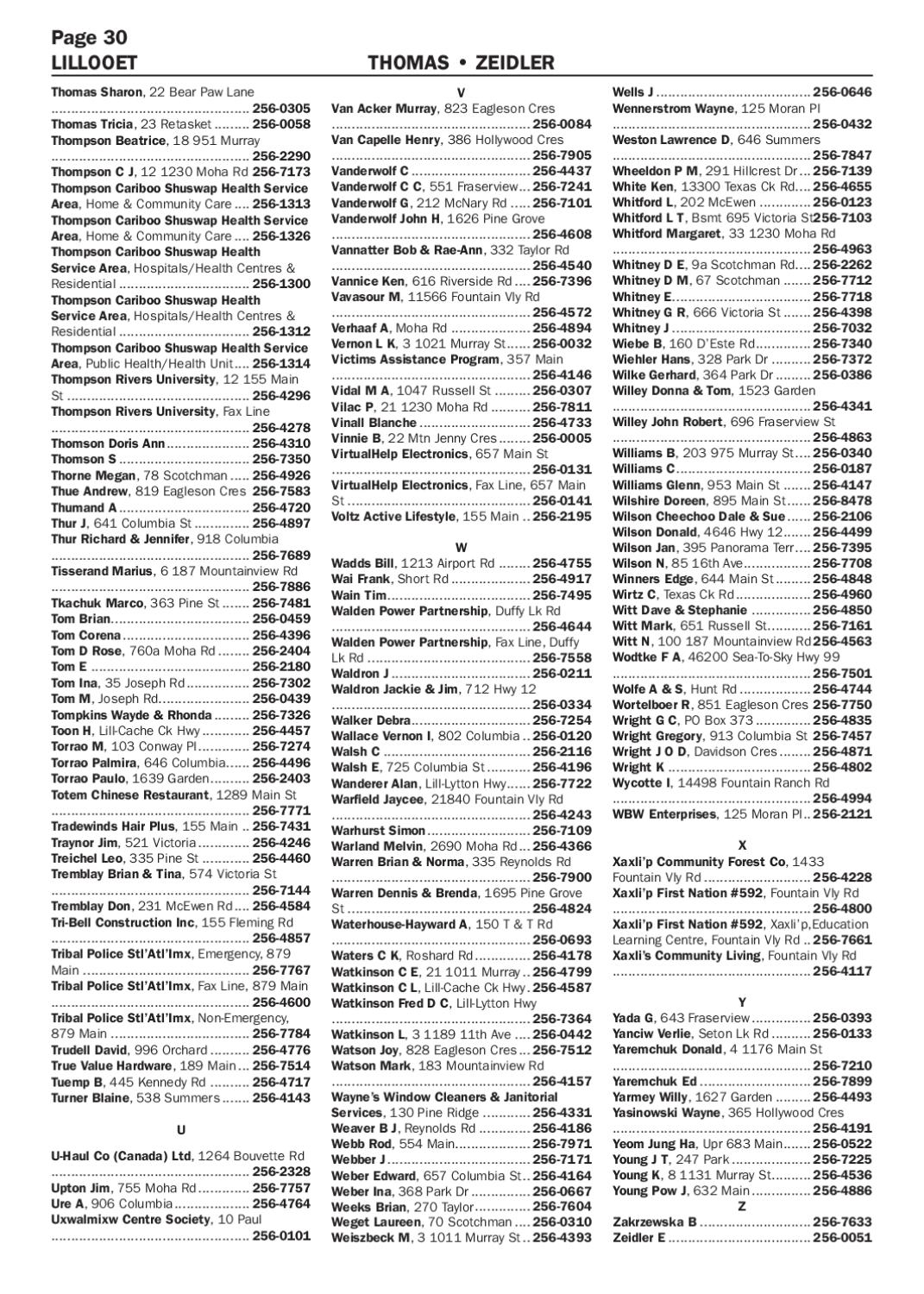 Wells J........................................ 256-0646 Wennerstrom Wayne, 125 Moran Pl .................................................. 256-0432 Weston Lawrence D, 646 Summers .................................................. 256-7847 Wheeldon P M, 291 Hillcrest Dr.... 256-7139 White Ken, 13300 Texas Ck Rd..... 256-4655 Whitford L, 202 McEwen.............. 256-0123 Whitford L T, Bsmt 695 Victoria St.256-7103 Whitford Margaret, 33 1230 Moha Rd .................................................. 256-4963 Whitney D E, 9a Scotchman Rd..... 256-2262 Whitney D M, 67 Scotchman........ 256-7712 Whitney E................................... 256-7718 Whitney G R, 666 Victoria St........ 256-4398 Whitney J.................................... 256-7032 Wiebe B, 160 D’Este Rd............... 256-7340 Wiehler Hans, 328 Park Dr........... 256-7372 Wilke Gerhard, 364 Park Dr.......... 256-0386 Willey Donna & Tom, 1523 Garden .................................................. 256-4341 Willey John Robert, 696 Fraserview St .................................................. 256-4863 Williams B, 203 975 Murray St..... 256-0340 Williams C................................... 256-0187 Williams Glenn, 953 Main St........ 256-4147 Wilshire Doreen, 895 Main St....... 256-8478 Wilson Cheechoo Dale & Sue....... 256-2106 Wilson Donald, 4646 Hwy 12........ 256-4499 Wilson Jan, 395 Panorama Terr..... 256-7395 Wilson N, 85 16th Ave.................. 256-7708 Winners Edge, 644 Main St.......... 256-4848 Wirtz C, Texas Ck Rd.................... 256-4960 Witt Dave & Stephanie................ 256-4850 Witt Mark, 651 Russell St............ 256-7161 Witt N, 100 187 Mountainview Rd.256-4563 Wodtke F A, 46200 Sea-To-Sky Hwy 99 .................................................. 256-7501 Wolfe A & S, Hunt Rd................... 256-4744 Wortelboer R, 851 Eagleson Cres.256-7750 Wright G C, PO Box 373............... 256-4835 Wright Gregory, 913 Columbia St. 256-7457 Wright J O D, Davidson Cres......... 256-4871 Wright K..................................... 256-4802 Wycotte I, 14498 Fountain Ranch Rd .................................................. 256-4994 WBW Enterprises, 125 Moran Pl... 256-2121 X Xaxli’p Community Forest Co, 1433 Fountain Vly Rd............................ 256-4228 Xaxli’p First Nation #592, Fountain Vly Rd .................................................. 256-4800 Xaxli’p First Nation #592, Xaxli’p,Education Learning Centre, Fountain Vly Rd... 256-7661 Xaxli’s Community Living, Fountain Vly Rd .................................................. 256-4117 Y Yada G, 643 Fraserview................ 256-0393 Yanciw Verlie, Seton Lk Rd........... 256-0133 Yaremchuk Donald, 4 1176 Main St .................................................. 256-7210 Yaremchuk Ed............................. 256-7899 Yarmey Willy, 1627 Garden.......... 256-4493 Yasinowski Wayne, 365 Hollywood Cres .................................................. 256-4191 Yeom Jung Ha, Upr 683 Main........ 256-0522 Young J T, 247 Park..................... 256-7225 Young K, 8 1131 Murray St........... 256-4536 Young Pow J, 632 Main................ 256-4886 Z Zakrzewska B............................. 256-7633 Zeidler E..................................... 256-0051