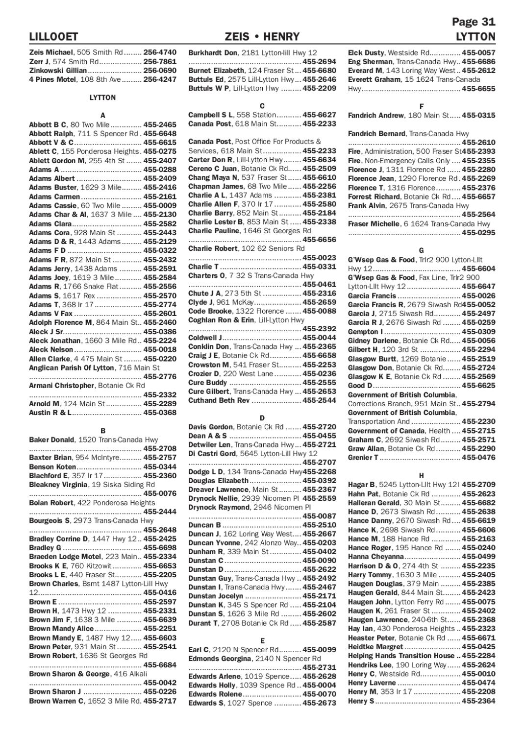 Fandrich Bernard, Trans-Canada Hwy .................................................. 455-2610 Fire, Administration, 500 Fraser St.455-2393 Fire, Non-Emergency Calls Only..... 455-2355 Florence J, 1311 Florence Rd....... 455-2280 Florence Jean, 1290 Florence Rd.. 455-2269 Florence T, 1316 Florence............ 455-2376 Forrest Richard, Botanie Ck Rd..... 455-6657 Frank Alvin, 2675 Trans-Canada Hwy .................................................. 455-2564 Fraser Michelle, 6 1624 Trans-Canada Hwy .................................................. 455-0295 G G’Wsep Gas & Food, Trlr2 900 Lytton-Lllt Hwy 12........................................ 455-6604 G’Wsep Gas & Food, Fax Line, Trlr2 900 Lytton-Lllt Hwy 12......................... 455-6647 Garcia Francis............................. 455-0026 Garcia Francis R, 2679 Siwash Rd.455-0052 Garcia J, 2715 Siwash Rd............. 455-2497 Garcia R J, 2676 Siwash Rd......... 455-0259 Gempton I................................... 455-0309 Gidney Darlene, Botanie Ck Rd..... 455-0056 Gilbert H, 120 3rd St................... 455-2294 Glasgow Burtt, 1269 Botanie....... 455-2519 Glasgow Don, Botanie Ck Rd........ 455-2724 Glasgow K E, Botanie Ck Rd......... 455-2569 Good D........................................ 455-6625 Government of British Columbia, Corrections Branch, 951 Main St... 455-2794 Government of British Columbia, Transportation And....................... 455-2230 Government of Canada, Health..... 455-2715 Graham C, 2692 Siwash Rd.......... 455-2571 Graw Allan, Botanie Ck Rd............ 455-2290 Grenier T..................................... 455-0476 H Hagar B, 5245 Lytton-Lllt Hwy 12l. 455-2709 Hahn Pat, Botanie Ck Rd.............. 455-2623 Halleran Gerald, 30 Main St.......... 455-6682 Hance D, 2673 Siwash Rd............ 455-2638 Hance Danny, 2670 Siwash Rd..... 455-6619 Hance K, 2698 Siwash Rd............ 455-6606 Hance M, 188 Hance Rd.............. 455-2163 Hance Roger, 195 Hance Rd........ 455-0240 Hanna Cheyanna.......................... 455-0499 Harrison D & O, 274 4th St.......... 455-2235 Harry Tommy, 1630 3 Mile........... 455-2405 Haugen Douglas, 379 Main.......... 455-2385 Haugen Gerald, 844 Main St......... 455-2423 Haugen John, Lytton Ferry Rd........ 455-0075 Haugen K, 261 Fraser St.............. 455-2402 Haugen Lawrence, 240-6th St...... 455-2368 Hay Ian, 430 Ponderosa Heights... 455-2323 Heaster Peter, Botanie Ck Rd....... 455-6671 Heidtke Margret.......................... 455-0425 Helping Hands Transition House... 455-2284 Hendriks Lee, 190 Loring Way....... 455-2624 Henry C, Westside Rd................... 455-0010 Henry Laverne............................. 455-0474 Henry M, 353 Ir 17...................... 455-2208 Henry S....................................... 455-2364