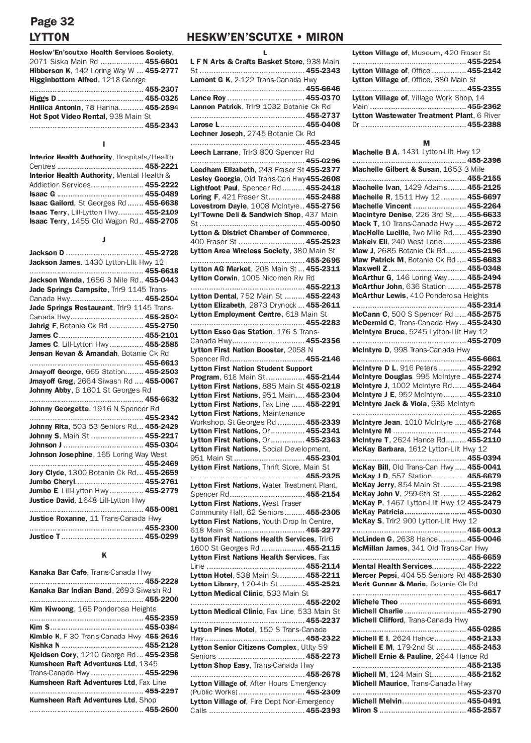 Lytton Village of, Museum, 420 Fraser St .................................................. 455-2254 Lytton Village of, Office................ 455-2142 Lytton Village of, Office, 380 Main St .................................................. 455-2355 Lytton Village of, Village Work Shop, 14 Main........................................... 455-2362 Lytton Wastewater Treatment Plant, 6 River Dr............................................... 455-2388 M Machelle B A, 1431 Lytton-Lllt Hwy 12 .................................................. 455-2398 Machelle Gilbert & Susan, 1653 3 Mile .................................................. 455-2155 Machelle Ivan, 1429 Adams......... 455-2125 Machelle R, 1511 Hwy 12............ 455-6697 Machelle Vincent........................ 455-2264 Macintyre Denise, 226 3rd St....... 455-6633 Mack T, 10 Trans-Canada Hwy...... 455-2672 MacHelle Lucille, Two Mile Rd....... 455-2390 Makeiv Eli, 240 West Lane........... 455-2386 Maw J, 2685 Botanie Ck Rd......... 455-2196 Maw Patrick M, Botanie Ck Rd..... 455-6683 Maxwell Z................................... 455-0348 McArthur G, 146 Loring Way......... 455-2494 McArthur John, 636 Station......... 455-2578 McArthur Lewis, 410 Ponderosa Heights .................................................. 455-2314 McCann C, 500 S Spencer Rd...... 455-2575 McDermid C, Trans-Canada Hwy.... 455-2430 McIntyre Bruce, 5245 Lytton-Lllt Hwy 12 .................................................. 455-2709 McIntyre D, 998 Trans-Canada Hwy .................................................. 455-6661 McIntyre D L, 916 Peters............. 455-2292 McIntyre Douglas, 995 McIntyre... 455-2274 McIntyre J, 1002 McIntyre Rd....... 455-2464 McIntyre J E, 952 McIntyre........... 455-2310 McIntyre Jack & Viola, 936 McIntyre .................................................. 455-2265 McIntyre Jean, 1010 McIntyre...... 455-2768 McIntyre M................................. 455-2744 McIntyre T, 2624 Hance Rd......... 455-2110 McKay Barbara, 1612 Lytton-Lllt Hwy 12 .................................................. 455-0394 McKay Bill, Old Trans-Can Hwy...... 455-0041 McKay J D, 557 Station................ 455-6679 McKay Jerry, 854 Main St............ 455-2198 McKay John V, 259-6th St............ 455-2262 McKay P, 1467 Lytton-Lllt Hwy 12.455-2479 McKay Patricia............................ 455-0030 McKay S, Trlr2 900 Lytton-Lllt Hwy 12 .................................................. 455-0013 McLinden G, 2638 Hance............. 455-0046 McMillan James, 341 Old Trans-Can Hwy .................................................. 455-6659 Mental Health Services............... 455-2222 Mercer Pepsi, 404 55 Seniors Rd.455-2530 Merit Gunnar & Marie, Botanie Ck Rd .................................................. 455-6617 Michele Theo.............................. 455-6691 Michell Charlie............................ 455-2790 Michell Clifford, Trans-Canada Hwy .................................................. 455-0285 Michell E I, 2624 Hance............... 455-2133 Michell E M, 179-2nd St.............. 455-2453 Michell Ernie & Pauline, 2644 Hance Rd .................................................. 455-2135 Michell M, 124 Main St................ 455-2152 Michell Maurice, Trans-Canada Hwy .................................................. 455-2370 Michell Melvin............................. 455-0491 Miron S....................................... 455-2557
