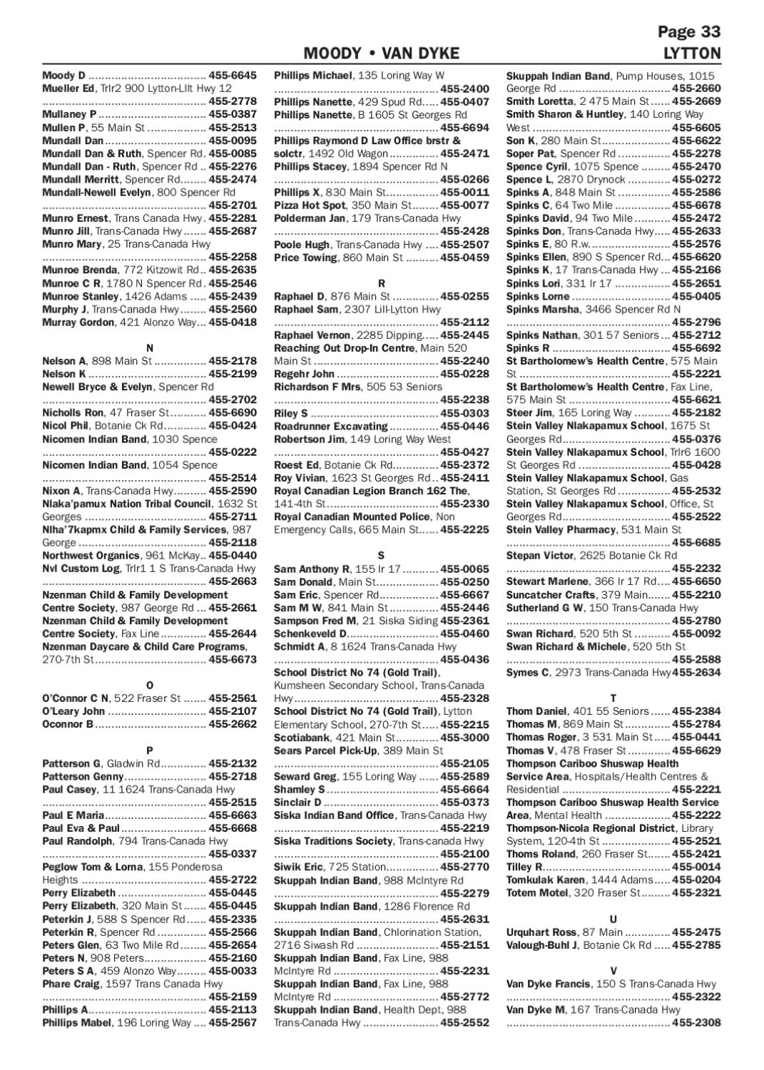 Phillips Michael, 135 Loring Way W .................................................. 455-2400 Phillips Nanette, 429 Spud Rd...... 455-0407 Phillips Nanette, B 1605 St Georges Rd .................................................. 455-6694 Phillips Raymond D Law Office brstr & solctr, 1492 Old Wagon................ 455-2471 Phillips Stacey, 1894 Spencer Rd N .................................................. 455-0266 Phillips X, 830 Main St................ 455-0011 Pizza Hot Spot, 350 Main St......... 455-0077 Polderman Jan, 179 Trans-Canada Hwy .................................................. 455-2428 Poole Hugh, Trans-Canada Hwy..... 455-2507 Price Towing, 860 Main St........... 455-0459 R Raphael D, 876 Main St............... 455-0255 Raphael Sam, 2307 Lill-Lytton Hwy .................................................. 455-2112 Raphael Vernon, 2285 Dipping...... 455-2445 Reaching Out Drop-In Centre, Main 520 Main St....................................... 455-2240 Regehr John................................ 455-0228 Richardson F Mrs, 505 53 Seniors .................................................. 455-2238 Riley S........................................ 455-0303 Roadrunner Excavating................ 455-0446 Robertson Jim, 149 Loring Way West .................................................. 455-0427 Roest Ed, Botanie Ck Rd.............. 455-2372 Roy Vivian, 1623 St Georges Rd... 455-2411 Royal Canadian Legion Branch 162 The, 141-4th St................................... 455-2330 Royal Canadian Mounted Police, Non Emergency Calls, 665 Main St...... 455-2225 S Sam Anthony R, 155 Ir 17............ 455-0065 Sam Donald, Main St.................... 455-0250 Sam Eric, Spencer Rd................... 455-6667 Sam M W, 841 Main St................ 455-2446 Sampson Fred M, 21 Siska Siding.455-2361 Schenkeveld D............................ 455-0460 Schmidt A, 8 1624 Trans-Canada Hwy .................................................. 455-0436 School District No 74 (Gold Trail), Kumsheen Secondary School, Trans-Canada Hwy............................................. 455-2328 School District No 74 (Gold Trail), Lytton Elementary School, 270-7th St...... 455-2215 Scotiabank, 421 Main St.............. 455-3000 Sears Parcel Pick-Up, 389 Main St .................................................. 455-2105 Seward Greg, 155 Loring Way....... 455-2589 Shamley S................................... 455-6664 Sinclair D.................................... 455-0373 Siska Indian Band Office, Trans-Canada Hwy .................................................. 455-2219 Siska Traditions Society, Trans-canada Hwy .................................................. 455-2100 Siwik Eric, 725 Station................ 455-2770 Skuppah Indian Band, 988 McIntyre Rd .................................................. 455-2279 Skuppah Indian Band, 1286 Florence Rd .................................................. 455-2631 Skuppah Indian Band, Chlorination Station, 2716 Siwash Rd.......................... 455-2151 Skuppah Indian Band, Fax Line, 988 McIntyre Rd................................. 455-2231 Skuppah Indian Band, Fax Line, 988 McIntyre Rd................................. 455-2772 Skuppah Indian Band, Health Dept, 988 Trans-Canada Hwy........................ 455-2552