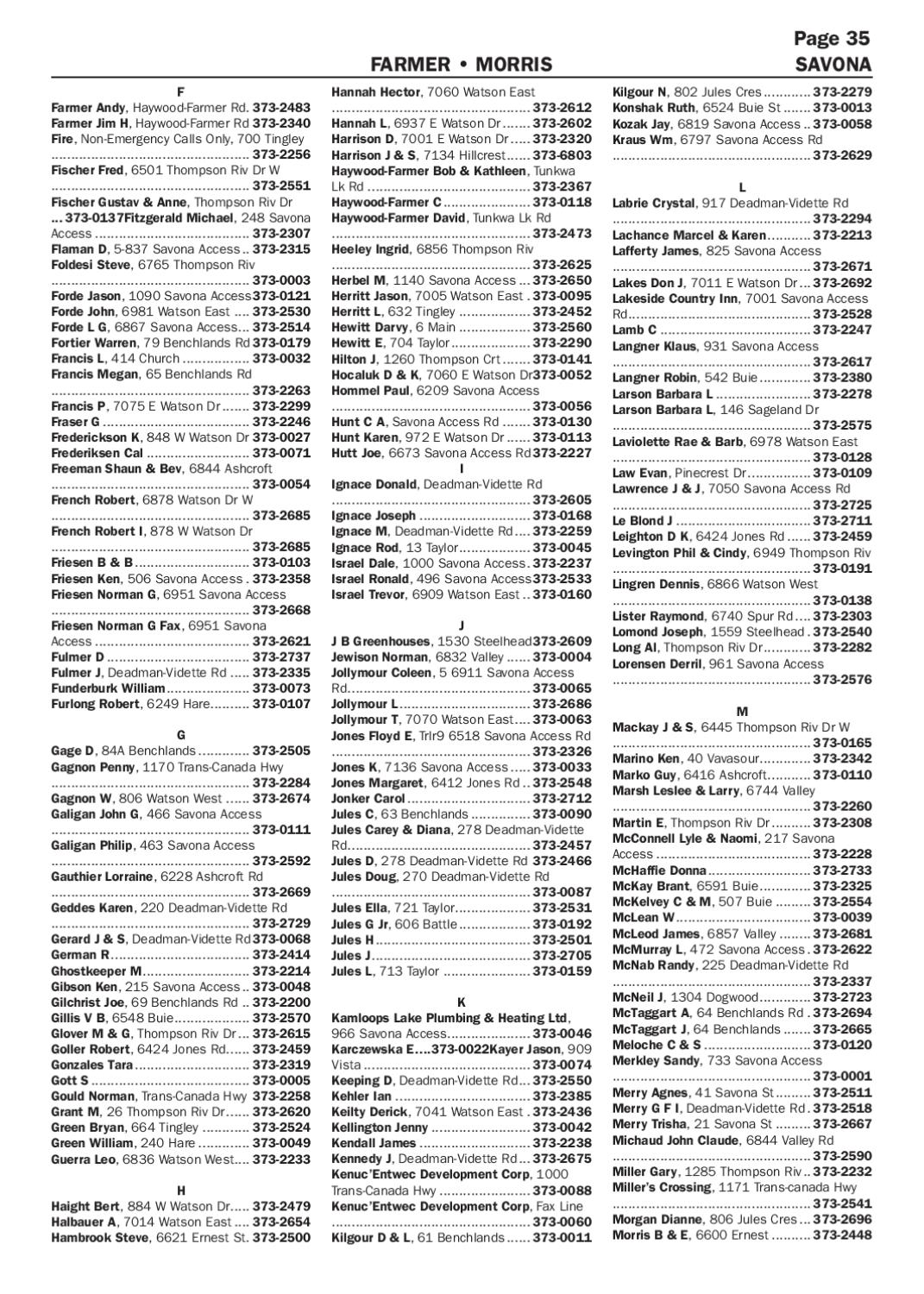 FARMER • MORRIS F Farmer Andy, Haywood-Farmer Rd.. 373-2483 Farmer Jim H, Haywood-Farmer Rd.373-2340 Fire, Non-Emergency Calls Only, 700 Tingley .................................................. 373-2256 Fischer Fred, 6501 Thompson Riv Dr W .................................................. 373-2551 Fischer Gustav & Anne, Thompson Riv Dr ... 373-0137Fitzgerald Michael, 248 Savona Access........................................ 373-2307 Flaman D, 5-837 Savona Access... 373-2315 Foldesi Steve, 6765 Thompson Riv .................................................. 373-0003 Forde Jason, 1090 Savona Access.373-0121 Forde John, 6981 Watson East..... 373-2530 Forde L G, 6867 Savona Access.... 373-2514 Fortier Warren, 79 Benchlands Rd.373-0179 Francis L, 414 Church.................. 373-0032 Francis Megan, 65 Benchlands Rd .................................................. 373-2263 Francis P, 7075 E Watson Dr........ 373-2299 Fraser G...................................... 373-2246 Frederickson K, 848 W Watson Dr.373-0027 Frederiksen Cal........................... 373-0071 Freeman Shaun & Bev, 6844 Ashcroft .................................................. 373-0054 French Robert, 6878 Watson Dr W .................................................. 373-2685 French Robert I, 878 W Watson Dr .................................................. 373-2685 Friesen B & B.............................. 373-0103 Friesen Ken, 506 Savona Access.. 373-2358 Friesen Norman G, 6951 Savona Access .................................................. 373-2668 Friesen Norman G Fax, 6951 Savona Access........................................ 373-2621 Fulmer D..................................... 373-2737 Fulmer J, Deadman-Vidette Rd...... 373-2335 Funderburk William...................... 373-0073 Furlong Robert, 6249 Hare.......... 373-0107 G Gage D, 84A Benchlands.............. 373-2505 Gagnon Penny, 1170 Trans-Canada Hwy .................................................. 373-2284 Gagnon W, 806 Watson West....... 373-2674 Galigan John G, 466 Savona Access .................................................. 373-0111 Galigan Philip, 463 Savona Access .................................................. 373-2592 Gauthier Lorraine, 6228 Ashcroft Rd .................................................. 373-2669 Geddes Karen, 220 Deadman-Vidette Rd .................................................. 373-2729 Gerard J & S, Deadman-Vidette Rd.373-0068 German R.................................... 373-2414 Ghostkeeper M............................ 373-2214 Gibson Ken, 215 Savona Access... 373-0048 Gilchrist Joe, 69 Benchlands Rd... 373-2200 Gillis V B, 6548 Buie.................... 373-2570 Glover M & G, Thompson Riv Dr.... 373-2615 Goller Robert, 6424 Jones Rd...... 373-2459 Gonzales Tara.............................. 373-2319 Gott S......................................... 373-0005 Gould Norman, Trans-Canada Hwy. 373-2258 Grant M, 26 Thompson Riv Dr....... 373-2620 Green Bryan, 664 Tingley............. 373-2524 Green William, 240 Hare.............. 373-0049 Guerra Leo, 6836 Watson West..... 373-2233 H Haight Bert, 884 W Watson Dr...... 373-2479 Halbauer A, 7014 Watson East..... 373-2654 Hambrook Steve, 6621 Ernest St.. 373-2500